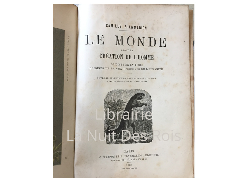 Exemplaire revêtu d'une reliure décorative du temps. L'ouvrage recèle une abondante iconographie in et hors-texte. ''S'il est une question qui ait toujours intrigué et même passionné la curiosité humaine, c'est assurément celle de l'origine du Monde. Camille Flammarion de l'examiner ici avec soin et d'en donner une édition élevée au niveau des progrès actuels de la science. Ainsi, l'oeuvre de la création se déroule ici, et pour la première fois, sans lacunes, depuis la formation de la nébuleuse solaire jusqu'à l'apparition de l'humanité elle-même.'' Angles et coupes élimés. Quelques frottements épars affectant le papier marbré des plats. Page de titre absente. Plissures aux premier et dernier feuillets (blancs). Inégales mais claires rousseurs dans le texte. Du reste, belle condition.