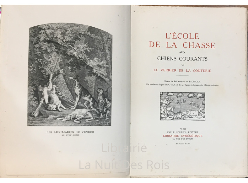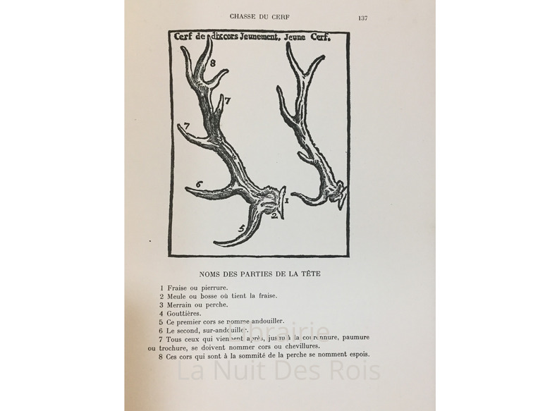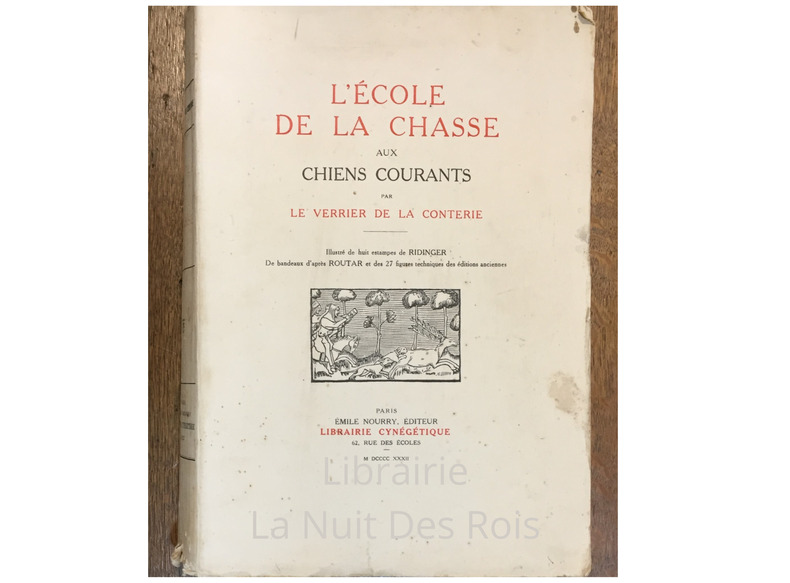 Tome V des Maîtres de la Vènerie Emile Nourry éditeur, Librairie Cynégétique, Paris, 1932, ix-354 pages. Exemplaire numéroté parmi 1050, celui-ci sur Alfa satiné, n°1001. Illustré de huit estampes de RIDINGER, de bandeaux d’après ROUTAR et des 27 figues techniques des éditions anciennes.