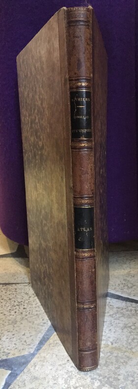 Adolphe THIERS, A. DUFOUR et DUVOTENAY Atlas de l'Histoire du Consulat et de l'Empire dressé et dessiné sous la direction de M. Thiers par MM. A. Dufour et Duvotenay. Paulin, Lheureux et Cie, libraires éditeurs, Paris, 1859. Bien complet de ses 66 cartes. Gravé sur acier par Dyonnet. Grand in-folio. 66 cartes (liste en regard de la page de titre) dont 4 en double page. Rousseurs, bon état général. Reliure dos de cuir marron, deux pièces de titre de cuir noir, coiffe supérieure manquante, mors très légèrement fendillés. Coins pliés mais cartonnage propre.