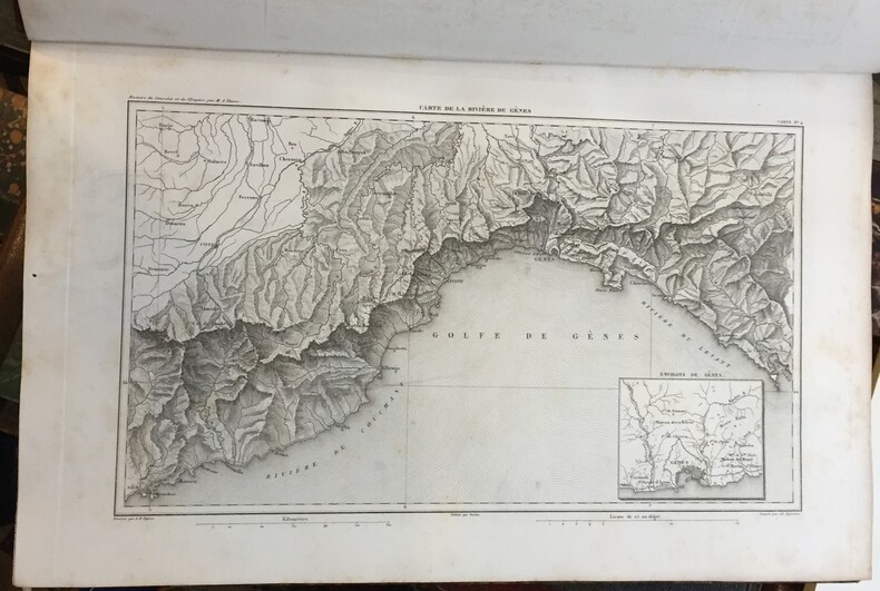 Paris, Paulin-Lheureux, 1845-62, atlas (1866), in-8vo, atlas in-folio, chaque volume env. 500 p., l'atlas comprend 66 cartes dont 7 sur double-page montées sur onglets (deux coloriées), non paginé, toutes les cartes en excellent état + 2 cartes ajoutées: une carte du Nord de l'Italie pour l'étude de la campagne de Napoléon III en1859 par le colonel Suisse F. Lecomte et une carte en fac-similé de la ville de Paris en 1576, reliures en pleine percaline verte, dos et plats estampés de filets à froid, quelques frottements et usures. Atlas in-folio relié en demi-chagrin, dos à nerfs orné de filets dorés, Généralement bel ensemble.