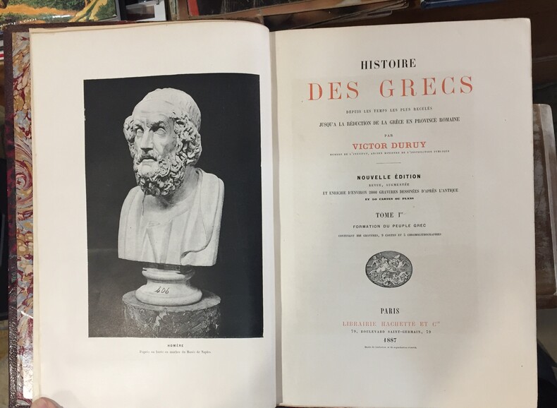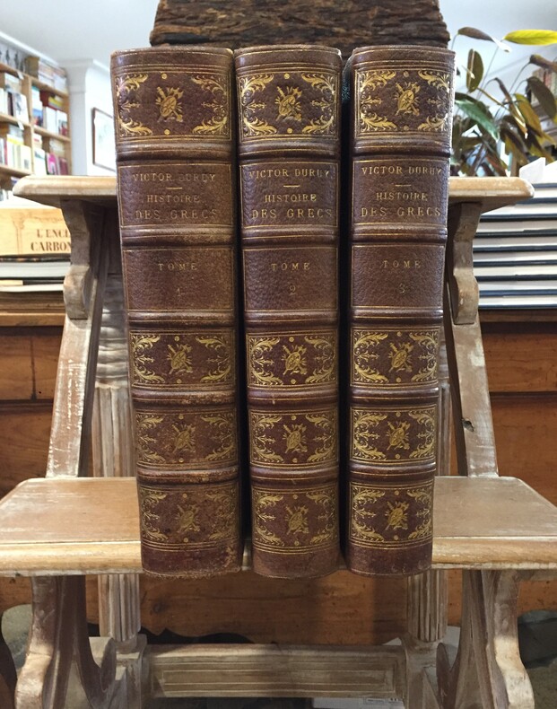 Nouvelle édition revue, augmentée et enrichie d’environ 2000 gravures dessinées d’après l’antique et 50 cartes ou plans. T1. Formation du peuple grec. Contenant 808 gravures, 9 cartes et 5 chromolithographies. T2. Depuis les Guerres Médiques jusqu’au Traité d’Antalcidas. Contenant 736 gravures, 4 cartes, 5 chromolithographies et 2 planches tirées hors texte. T3. Depuis le Traité d’Antalcidas jusqu’à la réduction de la Grèce en Province Romaine. Contenant 639 gravures, 13 cartes, 4 chromolithographies et 2 planches tirées hors texte. Libraire Hachette et Cie, Paris, 1887, 1888, 1889, 822, 749, 740 pages. Reliure demi cuir à coins, forts volumes. Double filets dorés en bordure des cuirs. Dos à 5 faus nerfs, caissons à motifs dorés. Tranches de tête dorées. En frontispice buste de Homère, buste de Périclès, portrait de Victor Duruy.
