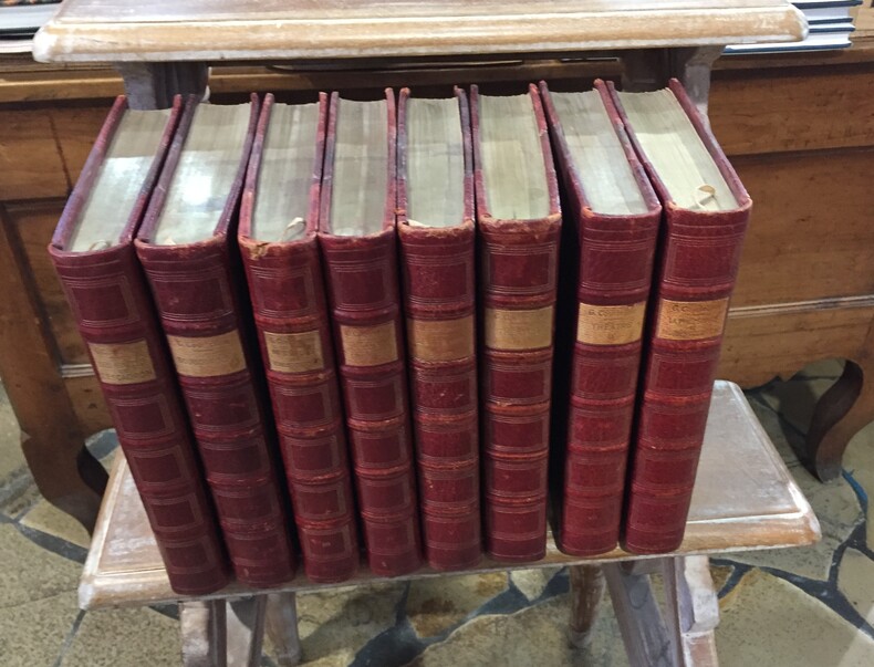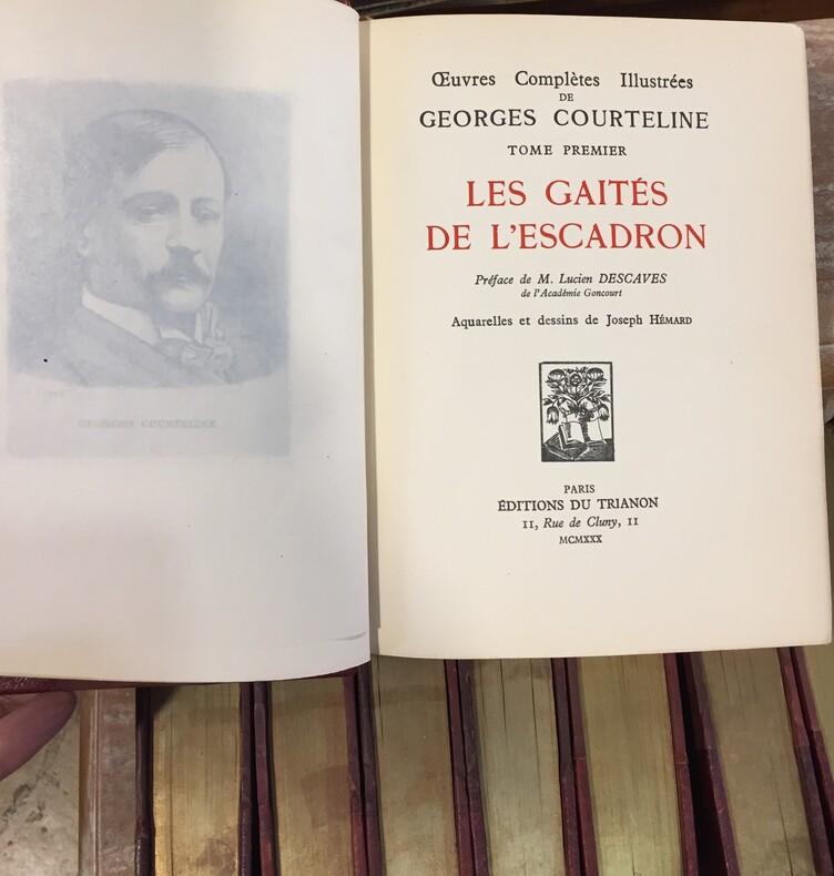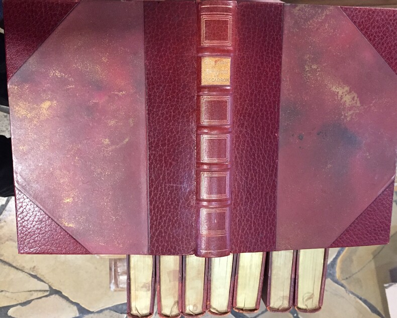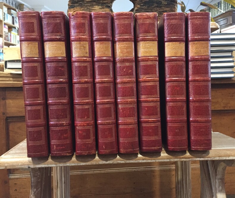 Editions du Trianon, Paris, 1930, Aquarelles et dessins de Joseph Hémard. Edition préfacée par Lucien Descaves. 8 volumes in-8, Reliure demi-maroquin rouge à coins, plats et contre plats de papier marbré rouge et doré, dos à 5 faux nerfs, caissons à trois filets dorés. Pièces de titre de cuir clair. Signets dorés. Bonne condition. Coiffes de tête des vol. 3 et 5 légèrement frottées. Tranches de têtes dorées, pages non rognées, couvertures imprimées et dos conservés.