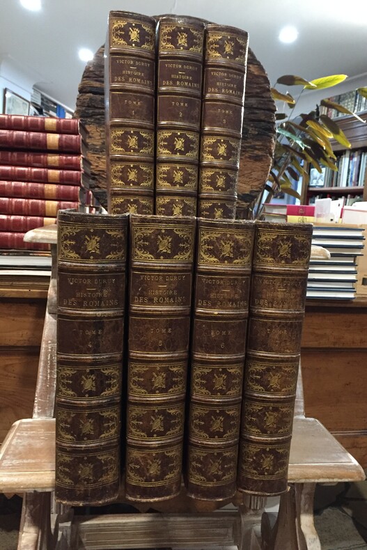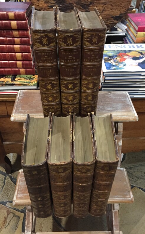 Nouvelle édition revue, augmentée et enrichie d'environ 3000 gravures dessinées d'après l'Antique et de 100 cartes ou plans, 7 vol. forts in-4 rel. demi-chagrin à coins bleu violet, dos à 5 nerfs, ill. noir et blanc et h. t. couleurs, double filet doré en coins et mors, tête dorée, Librairie Hachette & Cie, Paris, 1880-1885, 674 pp. ; 839 pp. ; 804 pp. ; 841 pp. ; 814 pp. ; 694 pp. ; 740 pp.. Rappel du titre complet : Histoire des Romains depuis les temps les plus reculés jusqu'à l'invasion des barbares ( 7 tomes - complet ) Tome I : Des origines à la fin de la Deuxième Guerre Punique ; II : De la bataille de Zama au premier Triumvirat ; II : César - Octave - Les commencements d'Auguste ; IV : D'Auguste à l'avènement d'Hadrien ; V : Hadrien, Antonin, Marc-Aurèle et la société Romaine dans le Haut-Empire ; VI : De l'avènement de Commode à la mort de Dioclétien ; VII : De l'avènement de Constantin à la mort de Théodose