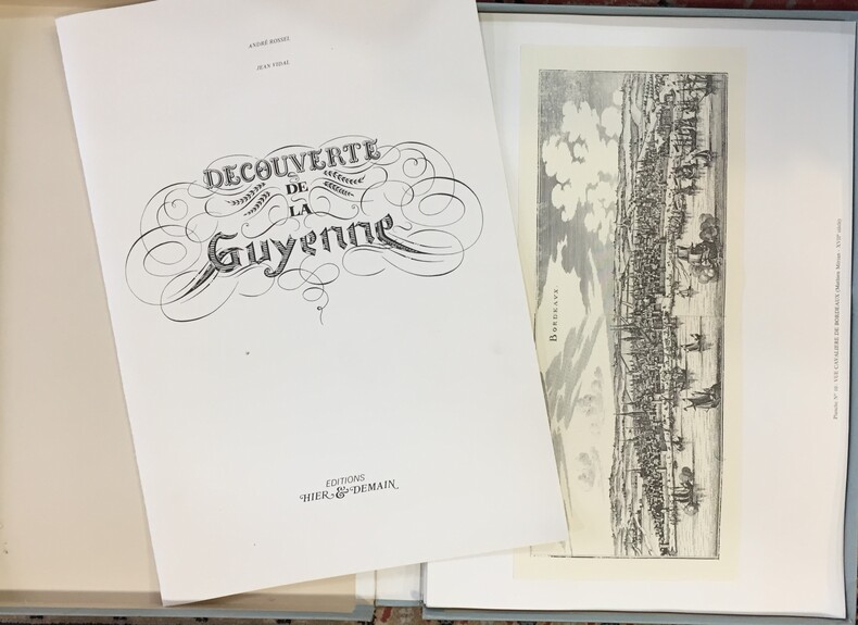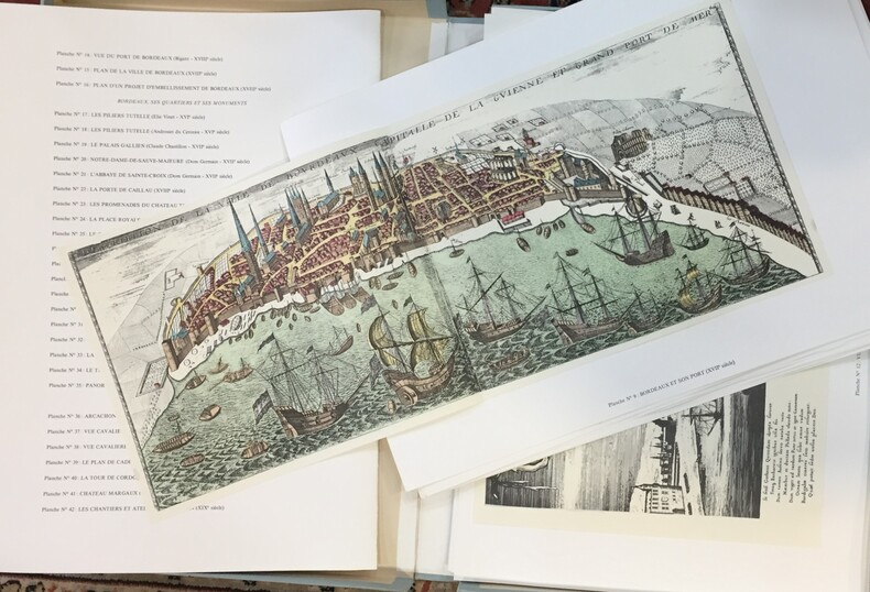 Editions Hier & Demain, 1971. Portfolio. Exemplaire n°482/499. 42 planches contre collées et légendées, dans un coffret de toile grise. Les documents reproduits proviennent notamment du Département des Cartes et Plans de la Bibliothèque Nationale, du Cabinet des Estampes, des Musées et bibliothèques locaux et de collections privées. 12 représentations de la Guyenne, 30 représentations de la ville de Bordeaux. Représentations couleurs et noir et blanc. Le coffret a de légères taches, intérieur en excellent condition.