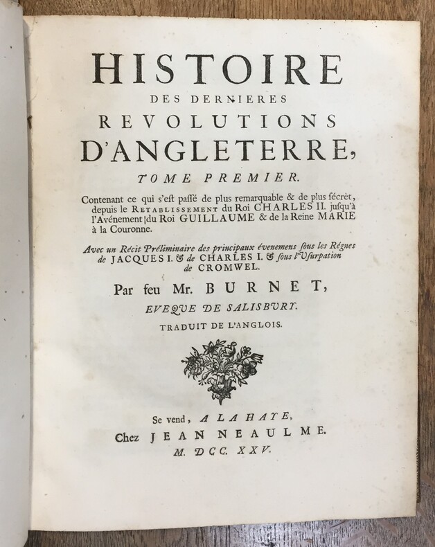 Histoire des dernières révolutions d'Angleterre - T.1. Contenant ce qui s'est passé de plus remarquable & de plus secret, depuis le rétablissement du Roi Charles II jusqu'à l'Avènement du Roi Guillaume & de la Reine Marie à la Couronne. Avec un récit préliminaire des principaux évènements sous les Règnes de Jacques I & et de Charles I & sous l'usurpation de Cromwel." Par feu Mr. Burnet, évêque de Salisbury, traduit de l'anglois. Se vend à La Haye, chez Jean Neaulme, 1725, préface + 356 pages. Reliure plein cuir, tranches rouges mouchetées, dentelles dorées sur les bords et encadrements des contre plats, dos à 5 nerfs, deux pièces de titre cuir rouge. Epidermures sur le cuir. Intérieur en excellente condition.