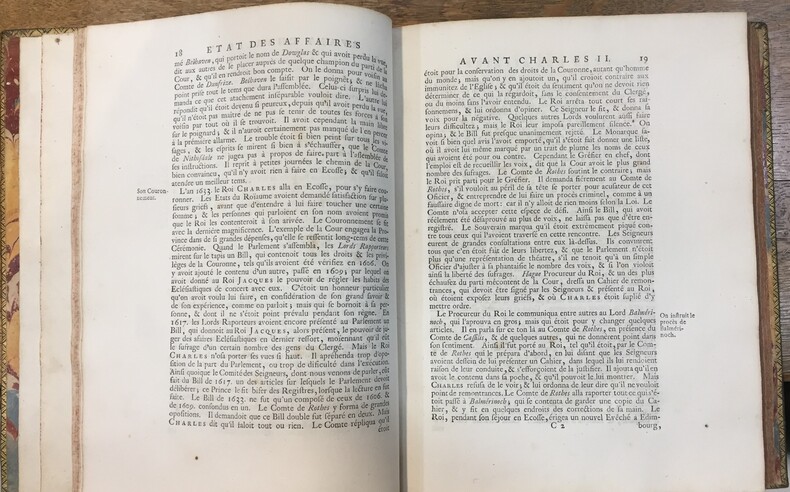 Deuxième édition française, la première dans ce format contenant ce qui s'est passé de plus remarquable et de plus secret depuis le rétablissement du Roi Charles II jusqu'à l'avènement du Roi Guillaume et de la Reine Marie à la Couronne, avec un récit préliminaire des principaux événements sous les règnes de Jacques I et de Charles I, sous l'usurpation de Cromwell.Portrait de l'auteur Gilbert Burnet (1643-1715) en frontispice et 14 portraits gravés. Table des matières à la fin de chaque tome. Notes manuscrites à l'encre du temps sur les gardes. Des feuillets roussis, coins émoussés, taches et coulures sur les reliures. Brunet, I, 1410.