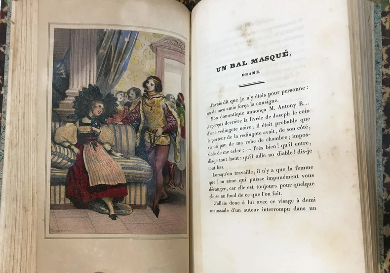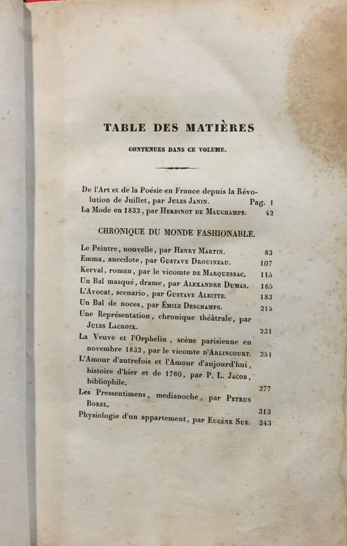 Par MM. Jules Janin, Henry Martin, Gustave Drouineau, vicomte de Marquessac, Alexandre Dumas, Gustave Albitte, Emile Deschamps, Jules Lacroix, vicomte d’Arlincourt, P.L. Jacob, Petrus Borel et Eugène Sue. Louis Janet libraire, Paris, 1833, 376 pages et 12 lithographies hors texte d’après Tony Johannot, Alfred Johannot, Devéria, A Mernut, etc. Dos cuir vert, mors supérieur fendu. Ouvrage rare.