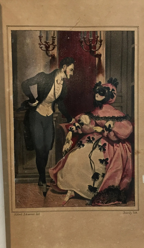 ÉDITION ORIGINALE très rare de cet album romantique de la mode. Il contient treize textes de Jules Janin, Henry Martin, Gustave Drouineau, du Vicomte de Marquessac, Alexandre Dumas, Gustave Albitte, Emile Deschamps, Jules Lacroix, du Vicomte d'Arlincourt, P. L. Jacob, Petrus Borel et Eugène Sue. L'illustration est composée d'UN TITRE gravé et de DOUZE FIGURES lithographiées représentant des couples dans des scènes d'intérieur, habillés avec élégance, d'après Devéria (8), Tony Johannot (2) et A. Menut (2). Elles sont remarquablement gravées. Une édition à la pagination identique, publiée à Paris en 1833 par Louis Janet est décrite dans Colas et dans Vicaire. Cette édition manque à la Bnf et au Worldcat. SUPERBE EXEMPLAIRE en maroquin décoré de l'époque. (Colas,59, pour l’édition de 1833 - Vicaire, I-25, pour l’édition de 1833). FINE COPY. PICTURES AND MORE DETAILS ON REQUEST.
