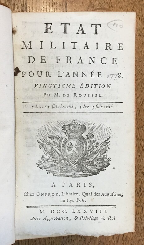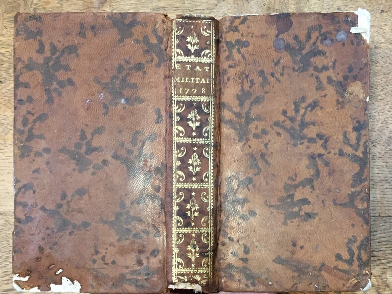 Paris Chez Onfroy, Libraire 1778 in 12 (14,5x8,5) 1 volume reliure pleine basane havane de l'époque, dos lisse orné, pièce de titre de maroquin rouge, tranches teintées rouge, VIII et 405 pages, mors fendus, petite trace de mouillure claire dans le bas des derniers feuillets. Annuaire officiel de l'armée pour l'année 1778, il renferme la liste du personnel du Ministère de la Guerre, des Gouverneurs des Provinces, de la maison du Roi, les Maréchaux et Généraux, officiers, et listes nominatives de tous les militaires du royaume. Rare. Bon exemplaire ( Photographies sur demande / We can send pictures of this book on simple request )