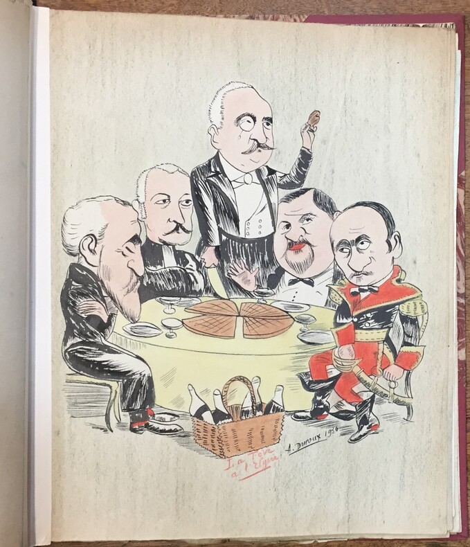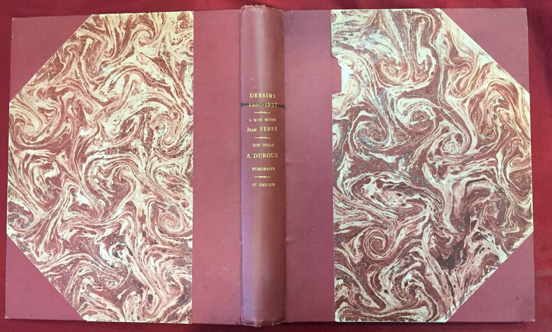 Edité par Sans éditeur. Originaux, 1936 Dessins orignaux reliés (101 + 1 feuille volante). Tous formats, tous supports. L'ensemble est relié, les dessins sont assemblés sur onglets. Reliure demi percaline à coins, dos avec cette mention qui est l'unique mention de l'ouvrage : "Dessins 1936-1937 - A mon neveu Jean Ferré - Son oncle A. Duroux humoriste - Saint-Emilion. La plupart des dessins sont des portraits, quelques-uns sont légendés. Quelques caricatures d'hommes politiques avec légendes. Couleurs. Tous les dessins sont signés et datés.