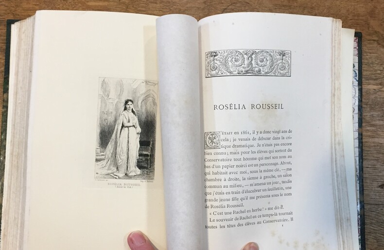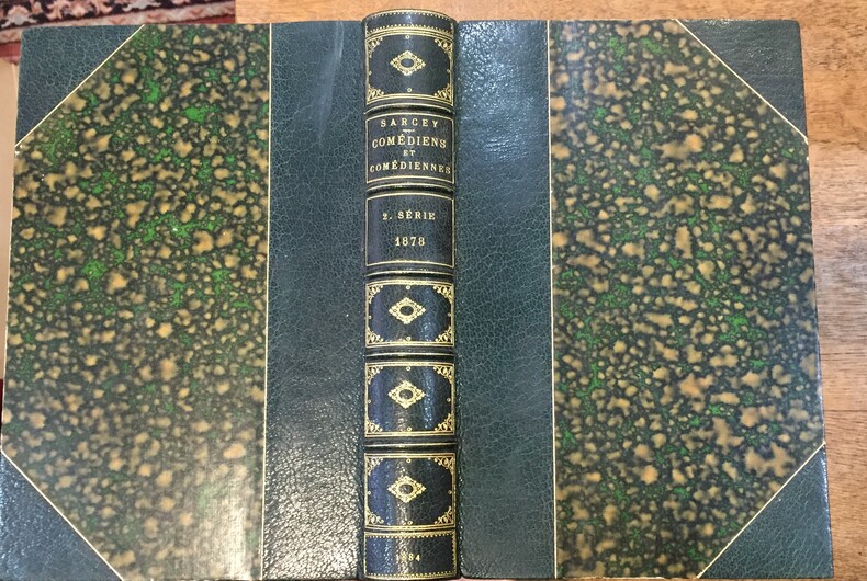 Edité par Librairie des Bibliophiles, Paris, 1884 Couverture rigide. Etat : Bon. Deuxième série, 1878, (la première série concerne la Comédie Française) Paris, Presses de Jouaust et Sigaux. 386 pages (20+19+23+24+24+28+24+24+28+31+23+23+24+24+24+24 pages). Portraits des artistes sous serpente gravés à l'eau-forte en frontispice de chaque notice. Textes de Francisque Sarcey présentant : Barré (Pierre-Jean dit Léopold), Coquelin Cadet (Alexandre-Honoré-Ernest), Delannoy (Léopold-Emile-Edmond), Adolphe Dupuis, Jane Essler, Anaïs Fargueil, Dinah Félix-Jeanne Samary, Jean-Marie-Michel Geoffroy, Louis Lafontaine, Marie Laurent, Léonide Leblanc, Madame Pasca, Blanche Pierson, Rosélia Rousseil, Saint-Germain (François-Victor-Arthur-Gilles de), Hippolyte Worms. Reliure demi cuir à coins. Très bon état. Bien complet, portraits hors texte. Reliure demi cuir à coins vert foncé. Dos orné de caissons dorés entre les 5 nerfs. Titre, date et auteur en lettre dorées. Rousseurs. Tranche de tête dorée.