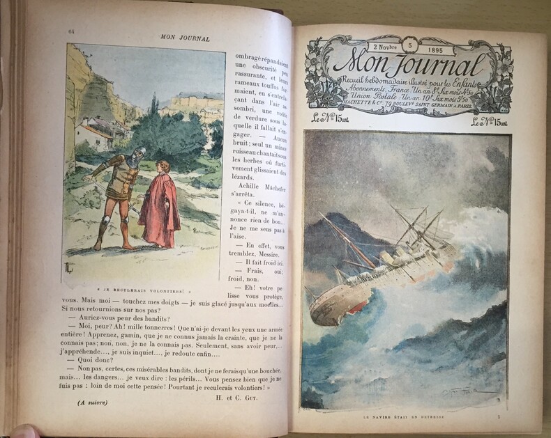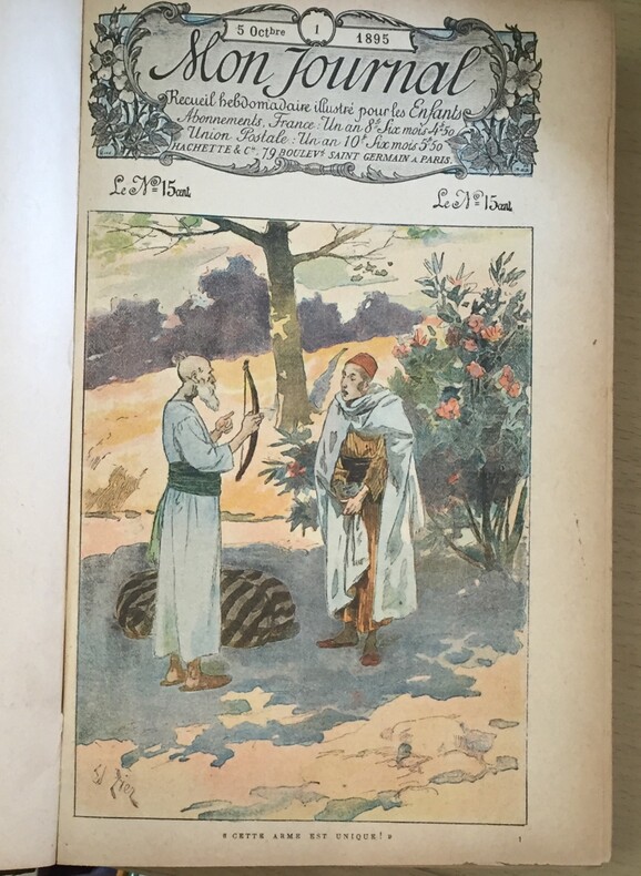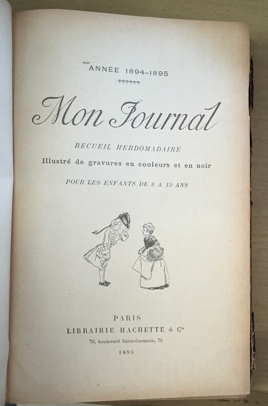 Recueil Hebdomadaire. Illustré de gravures en couleurs et en noir. 52 numéros. Librairie Hachette & Cie, Paris, 1895, du n°1 (5 octobre 1895) au n°52 (26 septembre 1896), 832 pages-table des matières. Reliure demi cuir marron, dos à 4 faux nerfs. Motifs, titre et date, filets dorés. Fort volume. Bords et coiffes frottés.