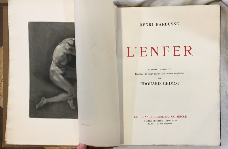 Edition définitive illustrée de 24 eaux-fortes originales par Edouard CHIMIOT. Les Grands Livres du XXe siècle, Albin Michel éditeur, Paris, 1921, 12 hors texte et 12 in-texte. Belle reliure, couverture et dos conservés, tranche de tête dorée. Demi maroquin à coins marron, dos à 5 nerfs, titre et auteur en lettres dorées. La page du frontispice se décolle légèrement de son onglet. Reliure en très bon état hormis des empreintes d’objets qui ont dû être posés dessus et un frottement sur un coin.