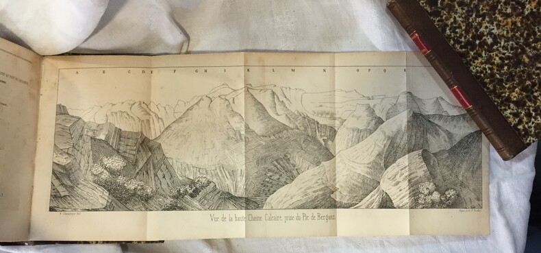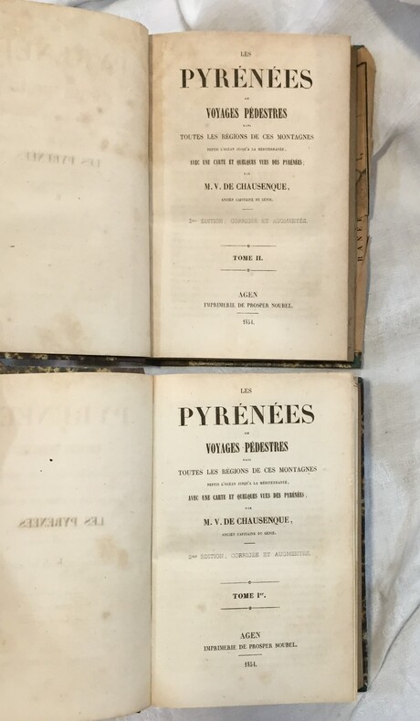 Deuxième édition corrigée et augmentée. Agen, imprimerie de Prosper Noubel, 1854, 573-carte dépliante-errata + 345-3 cartes dépliantes. Avec en fin d’ouvrage Catalogue des hauteurs mesurées dans les Pyrénées, table géographique des Pyrénées, table des matières. Reliure demi cuir marron, dos lisse à faux nerfs, deux pièces de titre et tomaison en cuir rouge. Petites rousseurs sur les faux titres.