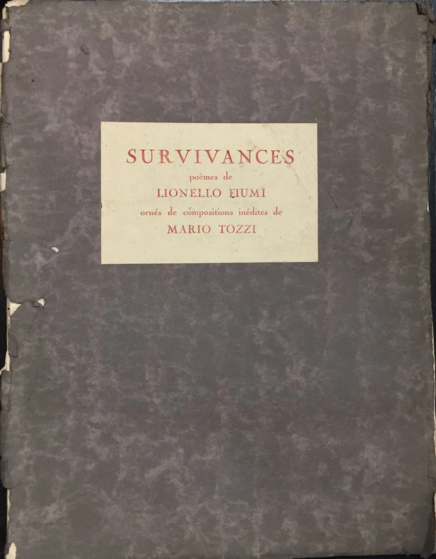 Poèmes de Lionello Fiumi traduits de l italien par Pierre de Nolhac de l Académie Française, Eugène Bestaux, Henri Marchaud, Alfred Mortier. Ornés de douze compositions originales de Mario Tozzi. Editions Sagesse, Paris, 1930, 80 pages, grand format raisin (26x34cm) in-4. Tirage limité à 403 exemplaires, celui-ci n°100, sur Vergé de Hollande. Couverture rempliée, le dos est hs, les plats sont désolidarisés. Vendu en l’état, d’où son petit prix. Bien complet de ses douze compositions. Derniers feuillets non coupés.