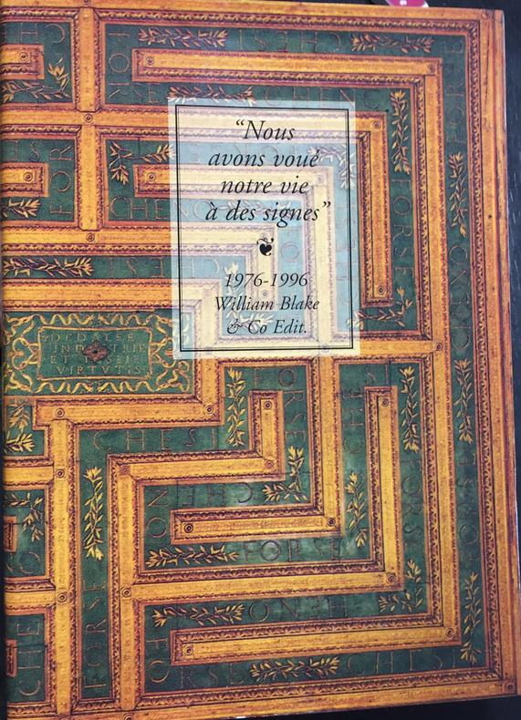 Bordeaux William Blake and Co. 1996 1 vol. broché in-4, broché, jaquette illustrée en couleurs, 384 pp. Luxueuse anthologie de textes qui ont accompagné l'aventure de William Blake and Co. depuis sa création, suivie d'une bibliographie des livres publiés par cet éditeur. Avec un bel envoi autographe signe de Jean-Paul Michel à Raphaël Sorin. Prière d'insérer joint également dédicacé. En bonne condition.