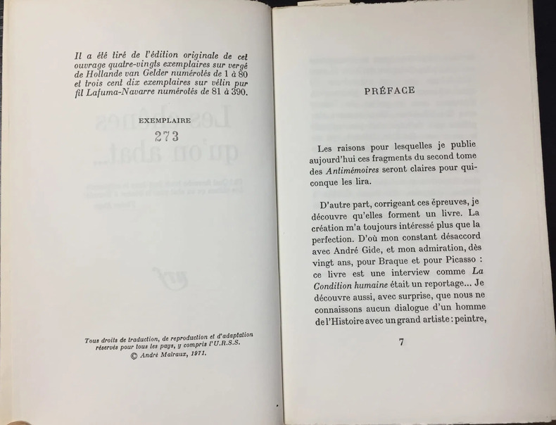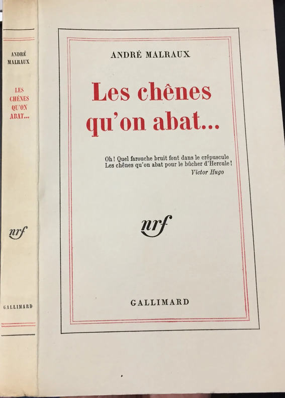 Edition originale, un des 80 exemplaires numérotés sur Hollande, tirage de tête (n°49)."Oh ! quel farouche bruit font dans le crépuscule les chênes qu'on abat pour le bûcher d'Hercule!". Deux vers de Victor Hugo en hommage à Théophile Gautier dont Malraux se sert pour illustrer ses derniers entretiens avec le général de Gaulle, en décembre 1969."Deux grandes voix fascinantes, ici, celle du génie et celle du héraut, se joignent pour évoquer leurs obsessions: lHistoire, la France, lHomme et la Mort" (Pierre Viansson-Ponté, "Le Monde", 16 mars 1971).Provenance: Bibliothèque Jacques Bredèche avec ex-libris à la devise "Savoir Bâtir".Parfait exemplaire, entièrement non coupé, tel que paru à l'état de neuf.