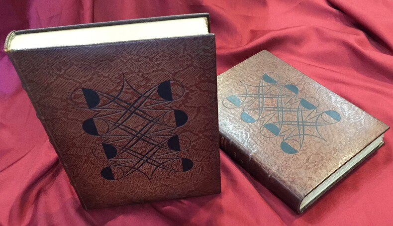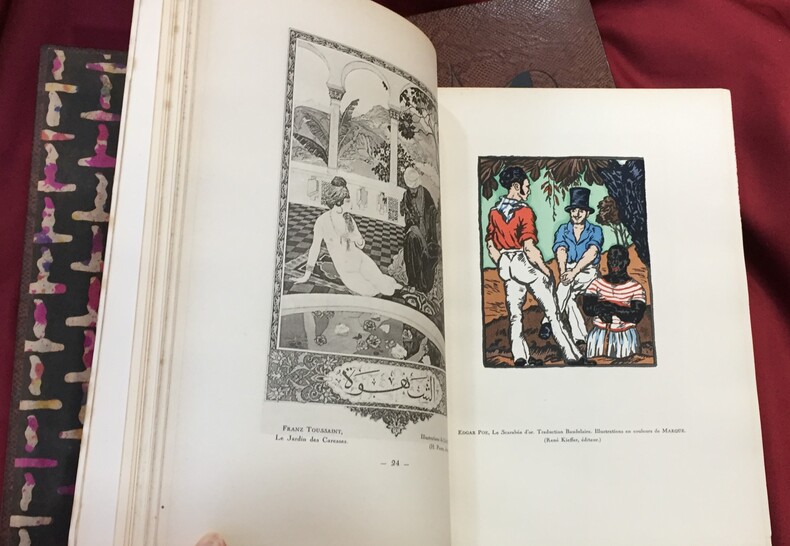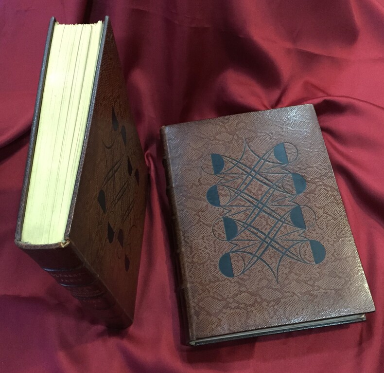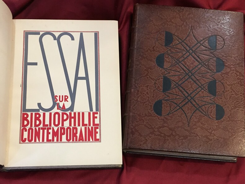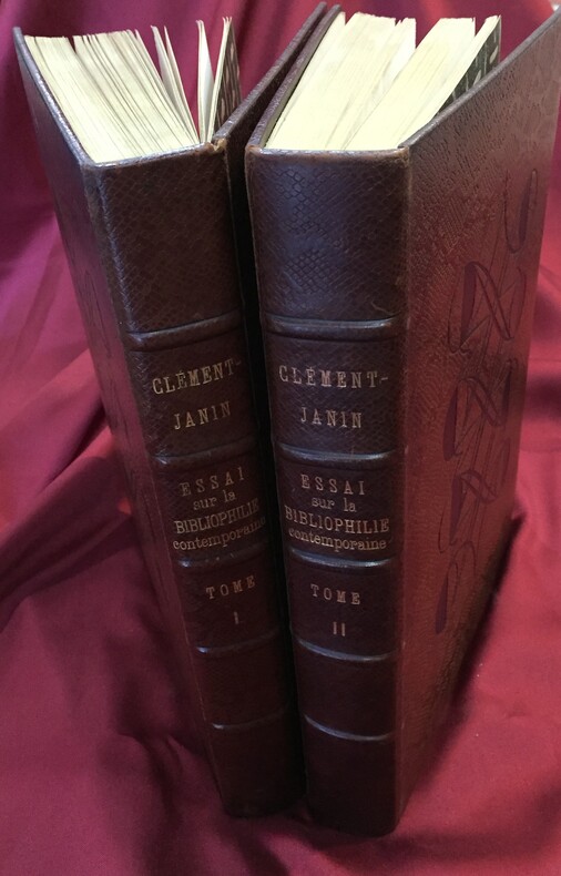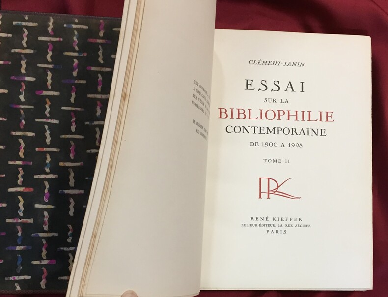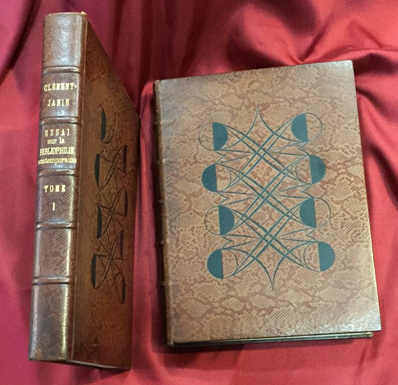 René Kieffer relieur-éditeur, Paris, 1931-1932, 253, 217 pages + table des chapitres. Imprimé sur les presses de Ducros et Colas maîtres imprimeurs à Paris. Une table des illustrateurs cités dans le texte, une table des auteurs et des volumes cités dans le texte, une table des reproductions et une table des hors-texte en fin de chaque volume : T1. 189 reproductions + 33 hors texte, T2. 180 reproductions + 83 hors texte. Illustrations dans le texte et hors texte en couleurs et en noir et blanc. Ce volume a été tiré à 500 exemplaires sur vélin à la forme numérotés de 1 à 500. Exemplaire n°107. Reliure de l’éditeur René Kieffer, pleine peau de serpent. Dos et couverture conservés. Dos à 5 nerfs, titre, auteur, tomaison en lettres dorées. Têtes dorées. Petites rousseurs en haut des premières et dernières pages des 2 volumes. Sur les plats motifs à froid géométriques et symétriques typiques Art Déco (dont l’apogée se situe au moment où cet ouvrage est imprimé). Décors noirs estampés. Très bel ensemble. Ouvrage exceptionnel à plus d’un titre.