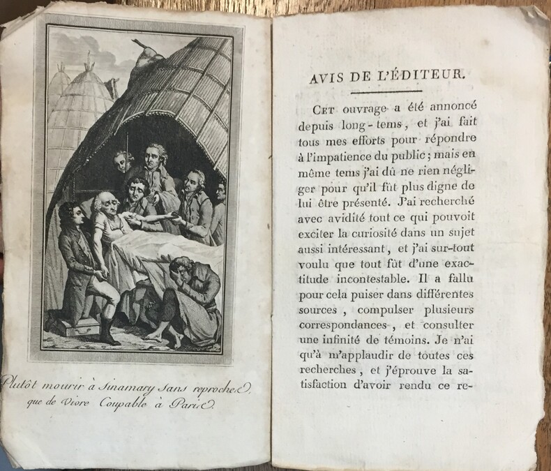 A Hambourg, s.n., 1799, Paris, chez Guiguet, s.d. (1799), 1 demi basane, coins velin, mors frottés, coiffe inférieure manquante. in-8, gravure en frontispice (mort du général Murinais à Sinamary), XII-199-3 pages et gravure en frontispice, (4)-II-239-(3) pages ;
