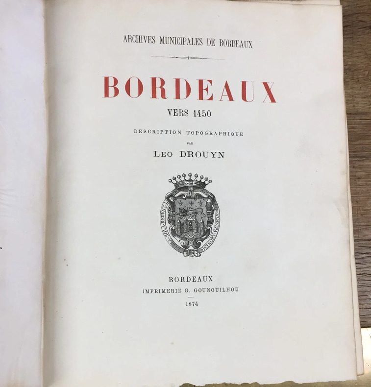 Bon état pour ce rare ouvrage aux marges immenses, imprimé sur beau papier vergé (dos un peu frotté, carte dépliante détachée avec petite restauration au verso, rares rouss.). Chargé par la Municipalité de Bordeaux d'établir un plan de Bordeaux vers la fin du Moyen-Age ainsi qu'une nomenclature topographique, le grand érudit et artiste Léo Drouyn (1816-1896) avait tout d'abord espéré des "Recherches et Mémoires" de l'abbé Baurein. Mais l'excellent auteur se taisant sur des points essentiels, Léo Drouyn décida de se plonger dans les Archives tant publiques que privées permettant de renseigner les points obscurs et de rédiger cet impressionnant ouvrage, qui demeure une somme incontournable pour la connaissance du Bordeaux médiéval.