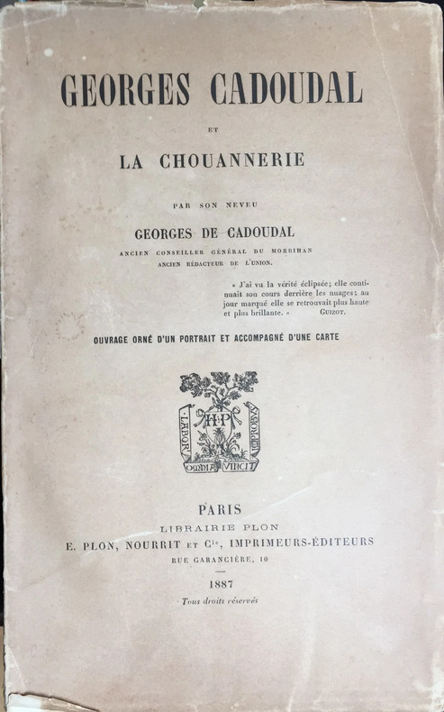 Par son neveu Georges de CADOUDAL Ouvrage orné d'un portrait (frontispice) et accompagné d'une carte dépliante. E. Plon, Nourrit et Cie, imprimeurs-éditeurs, Paris, 1887, 476 pages. Broché, quelques rousseurs en premières et dernières pages.