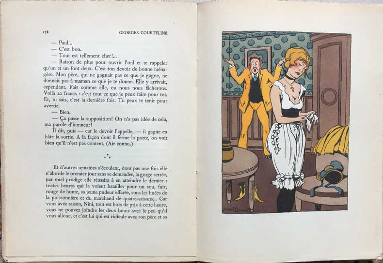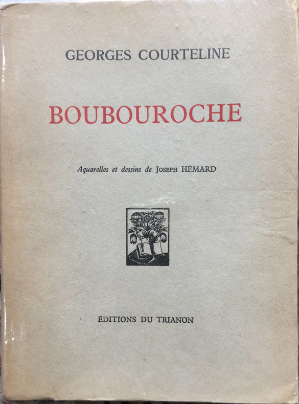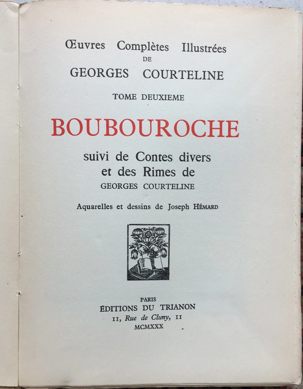 éditions du Trianon, impr. Imprimerie Crété, à Paris, coll. « Oeuvres complètes illustrées de Georges Courteline, Tome deuxième » 1930 In-8. Reliure demi-chagrin grenat à coins, couveture et dos conservés, dos à nerfs, tête dorée, 375 pp. Bel exemplaire.
