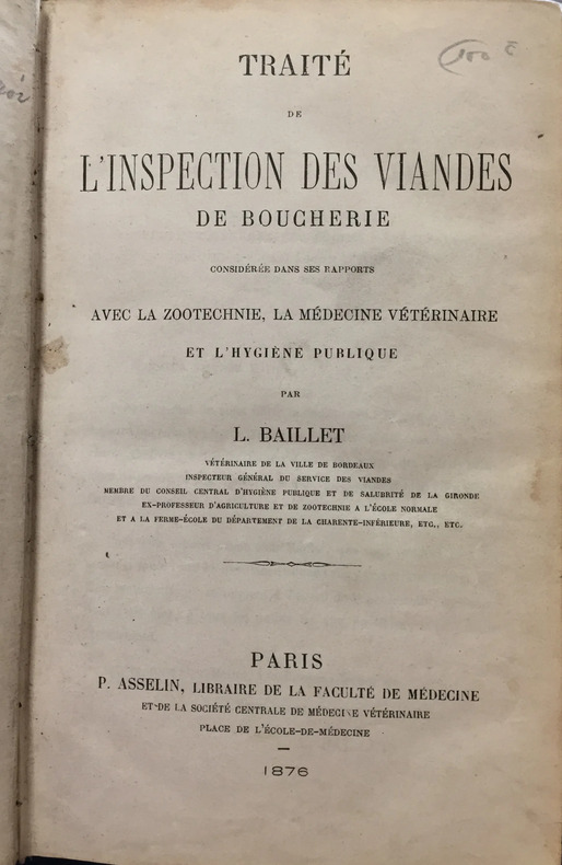 L'auteur, vétérinaire de la ville de Bordeaux. P. Asselin, libraire de la faculté de médecine et de la société centrale de médecine vétérinaire, Paris, 1876, 565 pages. Reliure demi maroquin bordeaux, plats état d'usage, dos 4 nerfs, bon état, fleurons et titre dorés.