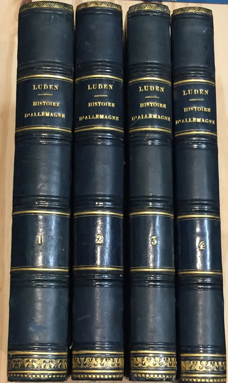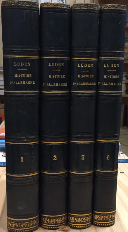 Imprimerie de Bethune et Plon, Paris, 1844, In-8. pp., 4 vol. Ex-libris: tampon encreur Ministère de l'intérieur, sûreté générale Haute-Garonne. Traduite et continuée jusqu'à nos jours d'après Schmidt, Pfefel, Menzel, Schiller, Posselt, Heinrich, Pfister, etc. Traduit par Auguste Savagner. Reliure demi cuir bleu, dos à 4 nerfs, filets dorés, dentelles sur les coiffes, titre, auteur et tomaison dorés. Bons ouvrages.
