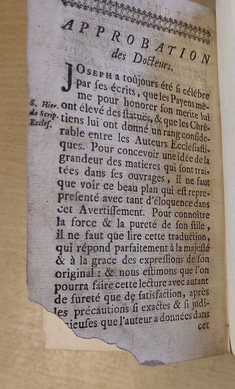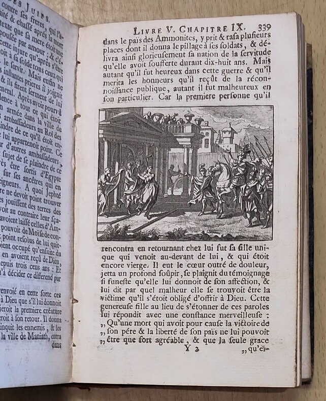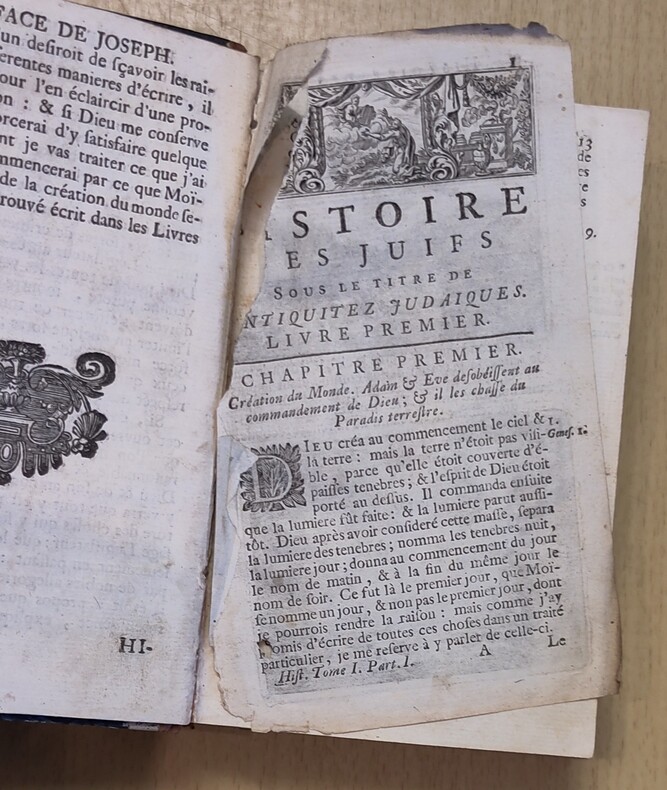 Traduction sur l’original grec revu sur divers manuscrits par M. Arnaud d’Andilly - Nouvelle édition Enrichi d’un grand nombre de figures en taille-douce inventées par R. Van Orley, contenant les anciennes cérémonies des Juifs. Chez Jean Léonard fils, Bruxelles, Nouvelle édition de 1738, 523 pages + avertissement de l’éditeur + préface de l’auteur. Culs-de-lampe, bandeaux, lettrines. 9X15cm. Table des chapitres et approbation des Docteurs en fin d’ouvrage. Reliure dos de cuir havane. Dos lisse, fers dorés et titrage doré, pièce de titre cuir noir. 2 pages partiellement déchirées. Plats cartonnés état d’usage.