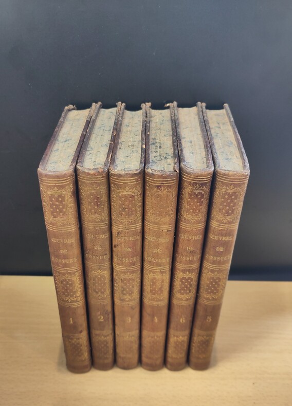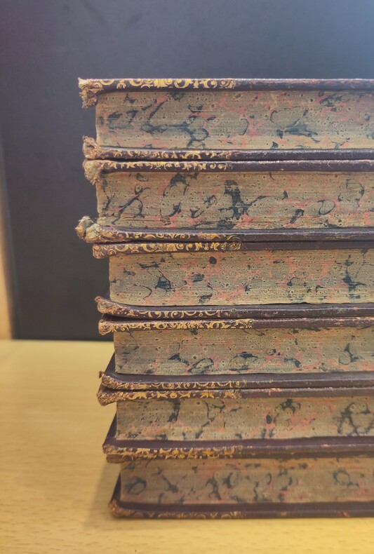 Edition Ch. J.-A. Greuze et Alexandre de Mat, 1848, Bruxelles. Pleine percaline brun sombre gaufrée par estampage à sec avec des motifs géométriques et floraux dans un encadrement doré. Dos insolés, titrage, tomaison et motifs dorés. Contre-plats et tranches jaspés. Dorures sur les coupes des coins et coiffes de queue encore visibles malgré des frottements. Le premier tome contient une préface des éditeurs belges et une préface de 37 pages de l’éditeur français. Signets manquant aux volumes 2, 5 et 6.