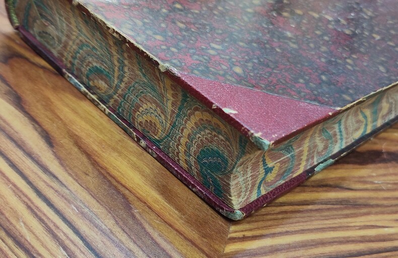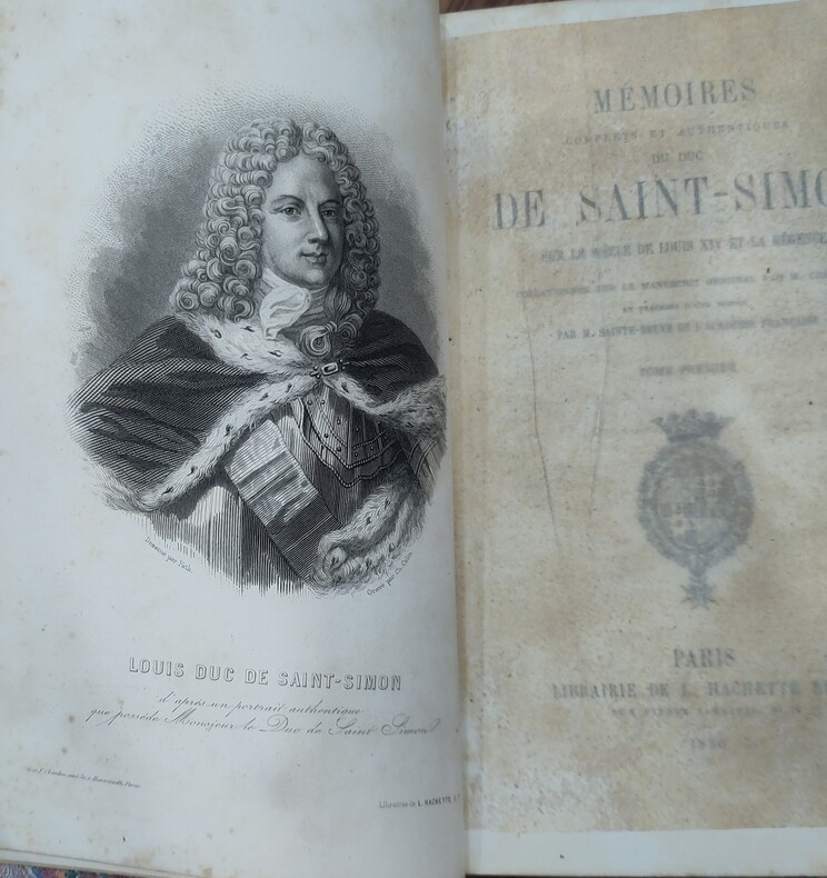 Titre complet « Mémoires complets et authentiques du Duc de Saint-Simon sur le Siècle de Louis XIV et la Régence » collationnés sur le Manuscrit original par M. Chéruel, édités entre 1856 et 1858 par Hachette et précédés d’une notice par M. Sainte-Beuve. Reliure demi cuir à coins bordeaux, contreplats et tranches jaspés, motifs de couleurs vives évoquant des plumes. Sur le rempli du premier tome est inscrit en lettres dorées le nom du libraire Auguste Fontaine, fondateur de la librairie Fontaine créée en 1834. Dos à 5 nerfs, titrage, tomaison et fer dorés. Gravure en frontispice sous serpente représentant Louis Duc de Saint-Simon dessiné par Fath d’après un portrait authentique. Le volume 18 contient un fac-similé d’une partie du manuscrit autographe de Saint-Simon ayant pour sujet les Mémoires de Dangeau. Le volume 20 comporte une photographie d’un extrait de l’original du testament olographe de Saint-Simon et une table alphabétique des matières et des noms propres contenus dans les Mémoires. Coins frottés, ainsi que bords et coiffes par endroits. Rousseurs dans les pages légèrement gondolées. Des feuilles écornées aux volumes 2 et 12. Petit accroc dans le haut de certaines pages du volume 10. Signets (sauf volumes 11, 14 et 18).