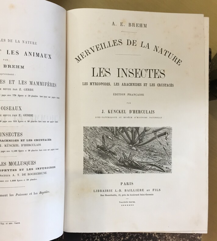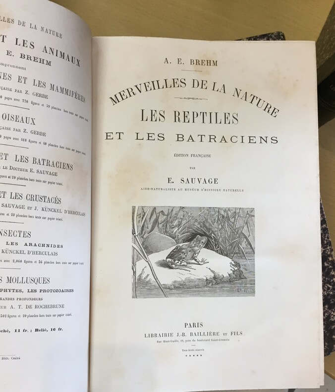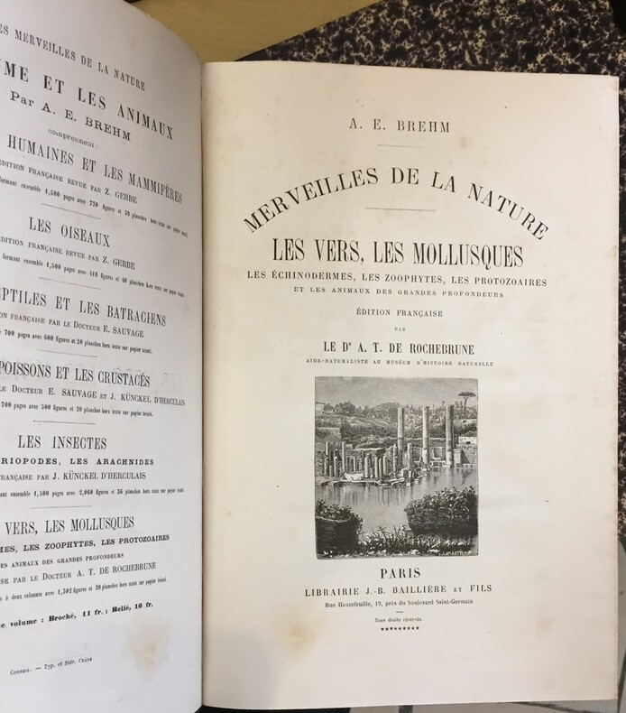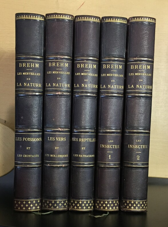 1. Les reptiles et les batraciens ; 2. Les vers, les mollusques, les échinodernes, les zoophytes, les protozoaires et les animaux des grandes profondeurs ; 3 et 4. Les insectes, les myriopodes, les arachnides et les crustacés (2vol.) ; 5. Les Poissons et les Crustacés. Edition française revue par Z. Gerbe. Librairie J.-B. Baillière et Fils, Paris, sd. Reliure demi cuir aubergine, dos à nerfs, titre auteur dorés. Dorures en coiffes. Petites épidermures sur les mors. Rousseurs comme la plupart des ouvrages fin XIXe début XXe.