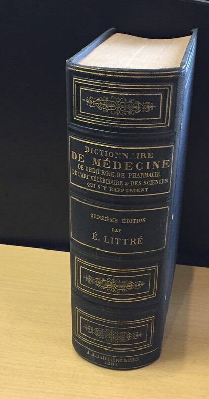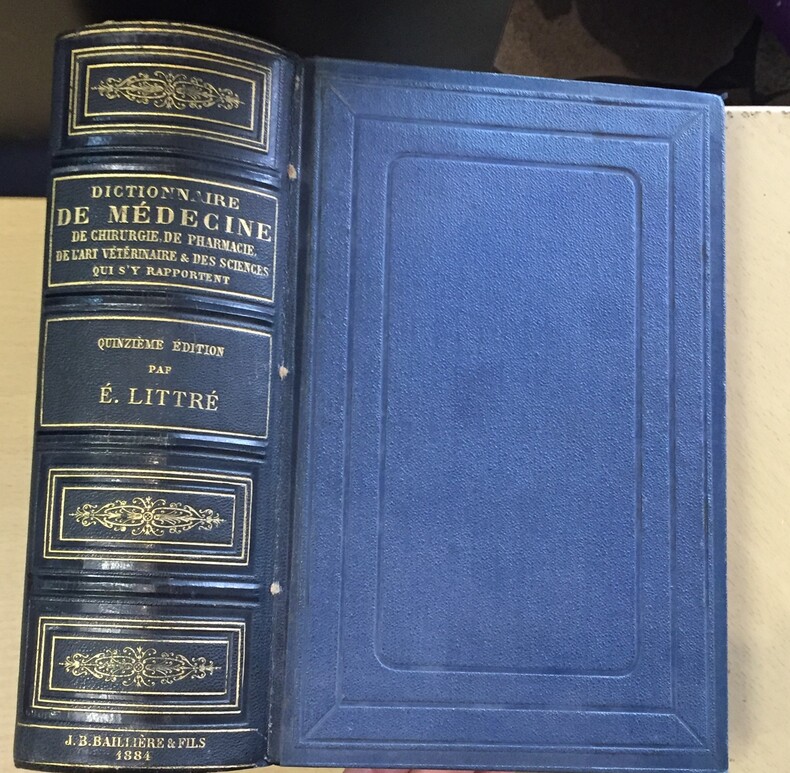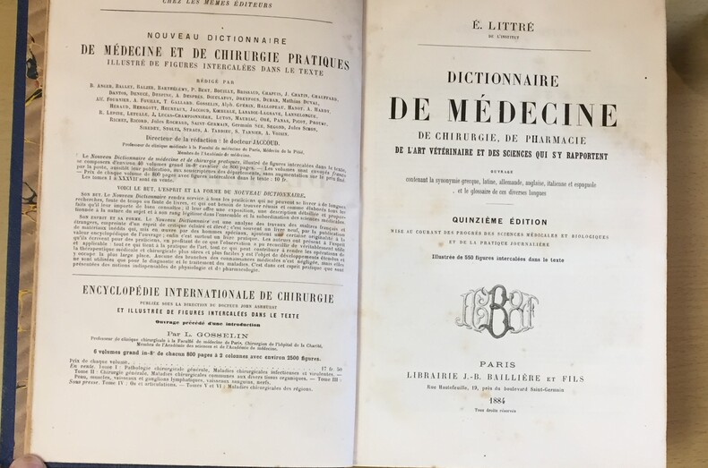 Libraire J.-B. Bailliere et Fils, Paris, 1884, 1880 pages et catalogue de l’éditeur. Quinzieme édition « Mise au Courant des Progrès des Sciences Médicales et Biologiques et de la Pratique Journalière. Illustrée de 550 figures intercalées dans le texte ». Fort volume relié, dos de cuir bleu marine, plats de percaline marine. Dos à motifs dorés en caisson, titre, auteur, édition, éditeur en lettres dorées. Très bon exemplaire.