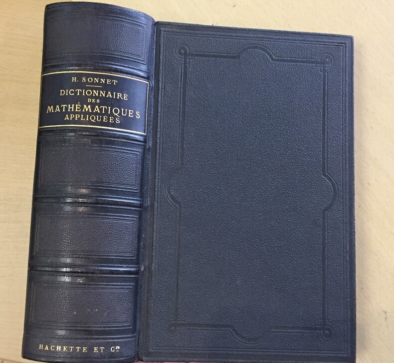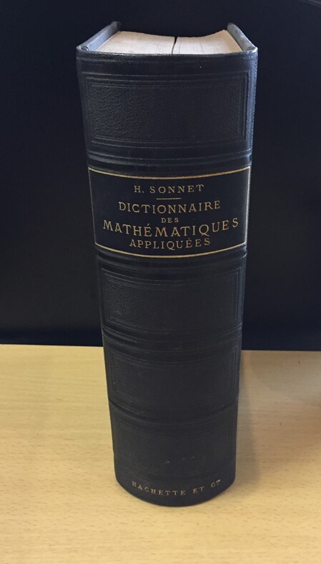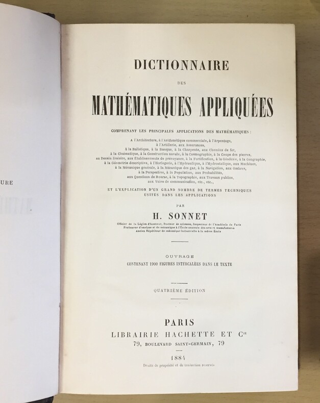 « Dictionnaire des Mathématiques Appliquées - Comprenant les principales applications des Mathématiques : à l'Architecture, à l’Arithmétique commerciale, à l’Arpentage, à l’Artillerie, aux Assurances, à la Balistique, à la Banque, à la Charpente, aux Chemins de fer, à la Cinématique, à la Construction navale, à la Cosmographie, à la Coupe des pierres, au Dessin linéaire, aux Etablissements de prévoyance, à la Fortification, à la Géodésie, à la Géographie, à la Géométrie descriptive, à l’Horlogerie, à l’Hydraulique, à l’Hydrostatique, aux Machines, à la Mécanique générale, à la Mécanique des gaz, à la Navigation, aux Ombres, à la Perspective, à la Population, aux Probabilités, aux Questions de Bourse, à la Topographie, aux Travaux publics, aux Voies de communications, etc. - Et l’Explication d’un grand nombre de termes techniques usités dans les applications ».