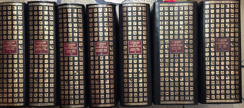 1872 PARIS, Lib.Bachelin-Déflorenne - 1872/73 - In-8 (23 cm) - Reliure 1/2 chagrin rouge, coins frottés - Dos à nerfs - - 14/21 volumes - Bel ensemble - PropreFAMILLES :III) BRYAS ou BRIAS, de la VILLE de FEROLLES, BERNARDON, DANZEL de BEAULIEU, d'ALBI FRENCAVEL de WEISS,, COLLIN, GORGUETTE d'ARGOEUVES, LAMBERT, PAYEN ou PAYAN, BROSSARD, MUSSET, O'MAHONY, LE SELLIER de CHEZELLE, LANGUET de SIVRY, GARIAC, FOURNIER de BOISMARTIN et de BELLEVUE, MONTAL ou de MONTALLY, CLICQUOT de TOSSICOURT, SULET d'HEUDICOURT-LENONCOURT, COUASNON, LA CELLE de CHATYEAUCLOS, de BROSSE, CHAMBRAY, CHEVERUE, de TROGOFF, HUGUES, de GIVES, BELOT de FERREUX, GENTIL, VIDAU, DONCQUER de T'SERROELOFFS, LE ROY de la GRANGE, MALLEVAUD, COMPAGNOLT, d'ALEZ d'ANDUSE ou d'ALES, de ALESTO, HONORATI, ALFONSE, SARRET de COUSSERGUES, de FABREGUES, PREVOST de SAINT-CYRLACCAUSSADE, ORO de PONTONX, de POSTEL, COSSERON de VILLENOISY, de RAYMOND, LAISNE de SAINTE-MARIE,, du HOUX, ARGIOT de la FERRIERE, BANYULS de MONTFERRE, GARIDEL, DEMARTIN, de CASTELBAJAC, CHAPT de RASTIGNAC, GUILLAUMANCHESdu BOSCAGE, MONTMORENCY, MILON, DUBOCAGE de BLEVILLE, BARTBIER de La SERRE, AUCAPITAINE de LIMANGES, MIRON, LE MANCEL, ROUSSEAU de RIMOGNE, MAHY de FAVRAS, PIGAULT de LEPINOY, ESTRICHE de BARACE, TOUSTAIN de FRONTEBOSC, CISTERNES de VINZELLE, du MESNIL de FIENE et de MARICOURT, MANDAT, SAHUGNET + Répertoireuniversel & Héraldique de la noblesse (avec Armoiries), Lettre A.IV) Dissertation sur la noblesse, les armoiries, Tableau historique des grands vassaux , de la couronne, de la Pairie et des Pairs de france, depuis l'institution de la monarchie jusqu'à ce jour - Familles d'USSEL, TAURIAC, GRIFFON, PASQUIER de FRANCLIEU, LAURENCIN, BALAHU de NOIRON, PICOT de PECCADUC, BEAUDRAND de PRADEL et de LA ROUE, GASQUET, AGNEL-BOURBON, BROCHARD de LA ROCHEBROCHARD, BARROIS de SARIGNY, des ESCOTAIS,, de CHABERT, CASTILLON, LE JEUNE de MALHERBE, ERARD, de RAVEL, GROUT, TULLES de VILLEFRANCHE, AUTIER ou HAUTIER de VILLEMONTEE, BENAVENT-RODEZ, de LA MORTE, WENDEL de HAYANGE, GODARD d'HAUCOUR, de CHARLUS de LABORDE, OUTREQUIN, KANDY ou CANDY, PREVOST de SAINT-CYR, de PRESSAC, ROBERT du CHATELET,, ASTORGA, ASTORG ou ASTORGUE, GAUDRY, FALLAGUE, FREVOL d'AUBIGNAC et de RIBAINS, EAUFORT de POTHEMONT, de RANCHER, BEAUPOIL de SAINT-AULAIRE, de CHATEUFUR, de ROUVROY, AMELINE de CADEVILLE, du MAS de LA ROQUE - Catalogue Général et alphabétique des Familles nobles de france admises dans l'ordre de Malte, suivi de la monenclature générales de chevaliers de Malte - Etat général des chevaliers de Malte publiés en 1789, de la langue de Provence, de la Langue de France, de la langue d'Auvergne, , du Prieuré d'Aquitaine , du prieuré de champagneVI) ISNARD, MAHEAS, JARNO, MOLETTE de MORANGUIES, CAIRE du LAUZET, GUIGNARD de SAINT-PRIEST-COQUEBERT, SERRE de SAINT-ROMAN, GEREAUX, BEAUCHAMP, BLANCHARDE, JACQUEMET de SAINT-GEORGE, SAUVEUR, SALVATOR, SALVAIRE d'ALEYRAC, GIRARD de CHARNACE, BETHUNE, MONTMORENCY-MORRES, du PUY, de GUANTER, ESTRICHE-BARACE, COURTIN, GUYOT, BATZ de TRENQUELLEON,, DEAN, LA CHAPELLE du BOUCHEROUX, LE PIGEON de VIERVILLE, de NAS, PONT de LIGONNES, ALLUIN, HALEWYN, LOUVART ou LOWART de PONT-LE-VOYE, DOMENY de RIENZI, BRIOIS, DIEULEVEULT, BARRES,, COSTART, BOILEAU de CASTELNAU, CAPDEVILLE, GRESLING ou GRELING, HARENG de GAUVILLE, SAINT-MAURIS, LENFANT, de LA TOUR EN VOIVREGIRAUD des ESCHEROLLES, de GALBERT, BARBEROT d'AUTET, RAMOND, + Nobiliaire de NORMANDIE complet + Seigneurs Normands en Angleterre + liste Seigneurs Normands en Terre-Sainte + RôlesVII) COCHEREL, de TOURNIER, ALEXANDRE de HANACHE, de SELLE, de la VILLE, ARMYNOT du CHATELET, ESPAGNET, HENIN de CUVILLIERS, BONNAVENT de BEAUMEVIELLE, de KEMPER ou QUEMPER de LANASCOL,, de MADRON,, de CUGNAC, COURTIN, ANDREE, ,de LAIGUE, de BOUBERS-ABBEVILLEZ-TUNC, LE GRAS du LUART, ROUILLE d'ORFEUIL, DANIEL, BOUTRAY, GENTIL, GAULLIER, de FAYET, LE CLEMENT de SAINT-MARCQ, LAMAJORIE-SOURSAC, de GLASON, BOREL du CHAMBON, LANGLADE du ,CHAYLA de MONTGROS, CLUGNY, GENSOUL, BOUCHEL de MERENVEUE, de la CROIX de CHEVRIERES, GLANS de CESSIAT, TILLY, SIBOUR, LARDENOY ou LARDENOIS, ROSTAING-CHAMPFERRIER, BELVEZER, ANDRE, CARR ou CARRE de LUZANCAY et de CARREVILLE, MONGEOT d'HERMONVILLE et de CHRISTON, BARBEYRAC, BRAGELONGUE, DOYEN, du MAISNIEL, de LAUR, GODDES de VARENNES, du BOURBLANC, de CHARRIER-MOISSARD, GAILLARD DE baccarat de DENOEUVRE, CARRERE, de la GARDE, ,de PASCAL DE saint6juery et de ROCHEGUDE,, CAGNIARD, de RIVIERE, HAYE de PLOUER, de ROCHAS, JACOBSEN ou JACOBS ou JACOBSON , de PRESEAUX d'ARGILLY, CLEREMBAULTde LOUBENS de VERDALLE, de FOUCHER, du COETLOSQUET, FROMENT, de CHOULY de PERMANGLE, THIROUX, de MARINE,, de CARRIERE,, PALYS, GUILHEN ou GUILHEM, CROUSILLACVIII) COCHEREL, TOURNIER, ALEXANDRE de HANACHE, SELLE, de La VILLE, HENIN de CUVILLERS, BONNAVENT de BEAUMEVIELLE, KEMPER ou QUEMPER de LANASCOL, MADRON, CUGNAC, CANEVARO, COURTIN, ABZAC, d'ANDREE, LAIGUE, de BOUBERS-ABBEVILLE-TUNC, Le GRAS du LUART, ROUILLE d'ORFEUIL, ROY de La PRESLE, DANIEL, BOUTRAY, de GENTIL, GAULLIER, de FAYET, LAMAJOPRIE-SOURSAC, DEGLASSON, BOREL de CHAMBON, LANGLADE du CHAYLA de MONTGROS, CLUGNY, GENSOUL, BOUCHEL de MERENVEUE, de La CROIX de CHEVRIERES, GLANS de CESSIAT, ROSTAING-CHAMPFERRIER, BELVEZER, de TILLY, SIBOUR, de LARDENOY, ANDRE, CARR ou CARRE de LUZANCAY & de CARREVILLE, MONGEOT d'HERMONVILLE 1 DE CHRISTON, BARBEYRAC, BRAGELONGNE, DOYEN, MAISNIEL, de LAUR, GODDES de VARENNES, BOURBLANC, de CHARRIER-MOISSARD, de GAILLARD de BACCARAT de DENOEUVRE, CARRERE, de La GARDE, de PASCAL de SAINT-JUERY & de ROCHEGUDE, CAGNIARD, dE RIVIERE, HAYE de PLOUER, ROCHAS, JACOBSEN, JACOBS ou JACOBSON & JACOPSEN, HUMBERT deTONNOY, CHASTEAU ou CHATEAU, ARMYNOT du CHATELET, ESPAGNET, Le CLEM%ENT de SAINT-MARCQ de TAINTEGNIES, GAUTIER, de PRESEAUX d'ARGILLY, CLEREMBAULT ou CLAIREMBAULT, LOUBENS de VERDALLE, FOUCHER, COETLOSQUET, FROMENT, dE CHOULY dE PERMANGLE, THIROUX, de MARINE, de CARRIERE, PALYS, GUILHEN ou GUILHEM, 