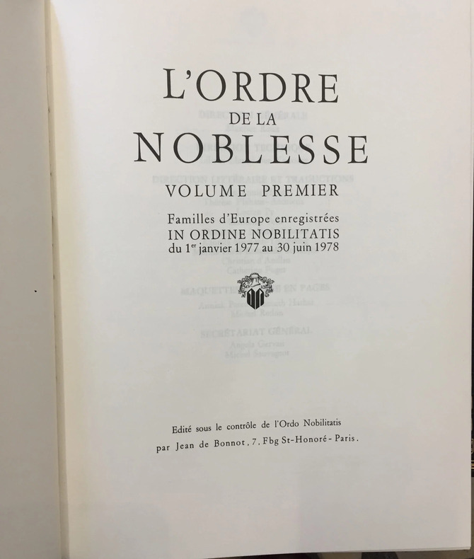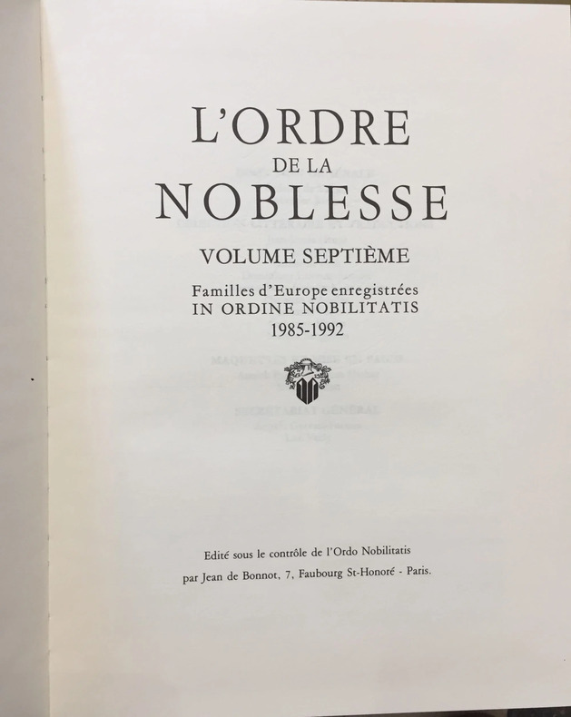 T1. Familles d'Europe du 1er Janvier 1977 au 30 Juin 1978. T2. du 1er Juillet 1978 au 31 Décembre 1978. T3. du 1er Janvier 1979 au 31 Octobre 1979. T4. du 1er Novembre 1979 au 31 Décembre 1980. T5. 1981-1982. T6. 1983-1984. T7. 1985-1992. 412, 523, 497, 639, 999, 849, 1140 pages. Editions Jean de Bonnot, Paris, édité sous le contrôle de l’Ordo Nobilitaris. 1978-1992. Reliure basane noir de l’éditeur, blasons estampés sur les plats, pièce de titre cuir rouge sur le dos. Tranches de têtes dorées. Tirage spécial, exemplaire de tête. Frais d’expédition à titre indicatif pour les 7 volumes.