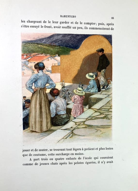 Paris Carteret Editeur 1922 In-8, maroquin rouge, armoiries poussées or au centre des plats encadrés d'un listel mosaïqué en maroquin brun entre deux filets dorés avec un petit motif floral poussé or et mosaïqué en maroquin vert à chaque angle; rappel du décor sur le dos à nerfs; doublures de maroquin citron encadrées d'un listel mosaïqué en maroquin brun et de trois filets dorés, gardes de soie moirée citron, doubles gardes de papier marbré, tranches dorées sur brochure, couverture imprimée. Etui (Canape et Corriez).Nouvelle édition de ce célèbre roman basque, illustrée par Jacques Camoreyt de 26 gravures in texte en couleurs. Tirage unique limité à 200 exemplaires numérotés sur vélin du Marais.