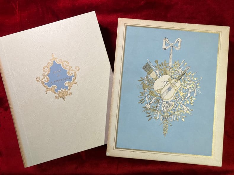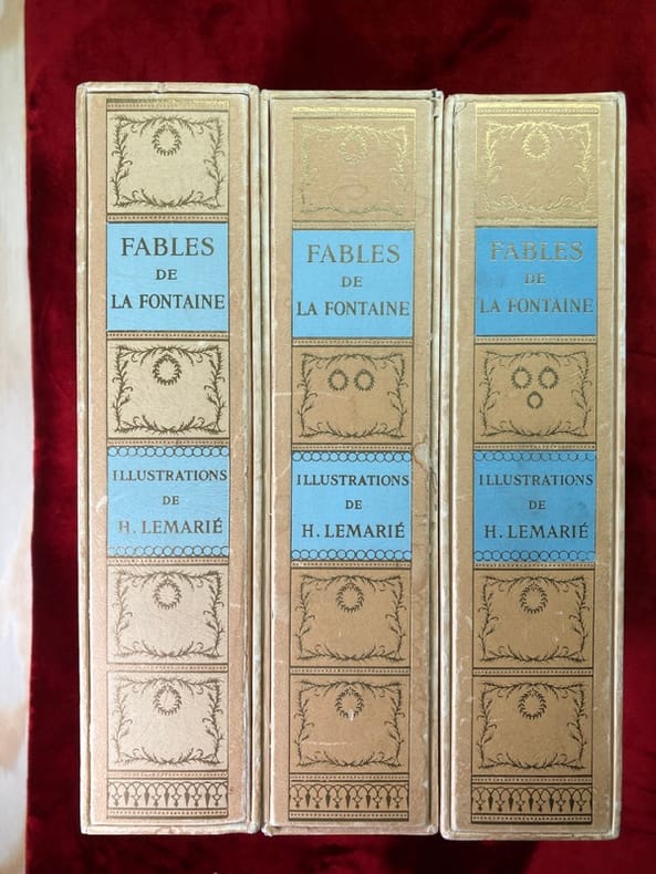 Paris Les Editions d'Art - Les Heures Claires 1962-1966 Trois volumes petit in-4 (h. 24 cm.), en feuilles, sous chemise et étui de l'éditeur, couverture illustrée, 194, 164, 209, pp. Fables illustrées de 60 bois gravés en couleurs d'après les aquarelles de Henry Lemarié. Exemplaires numérotés sur vélin de Rives avec une suite en noir.