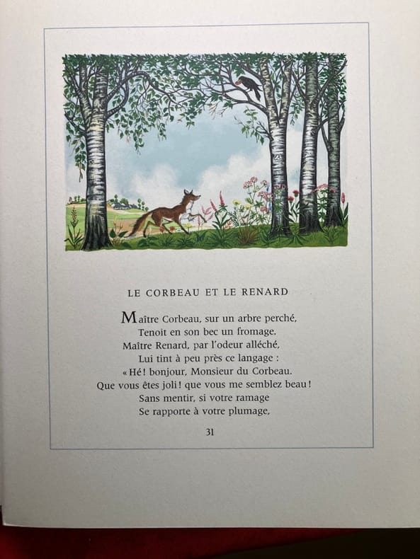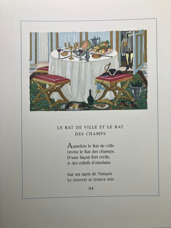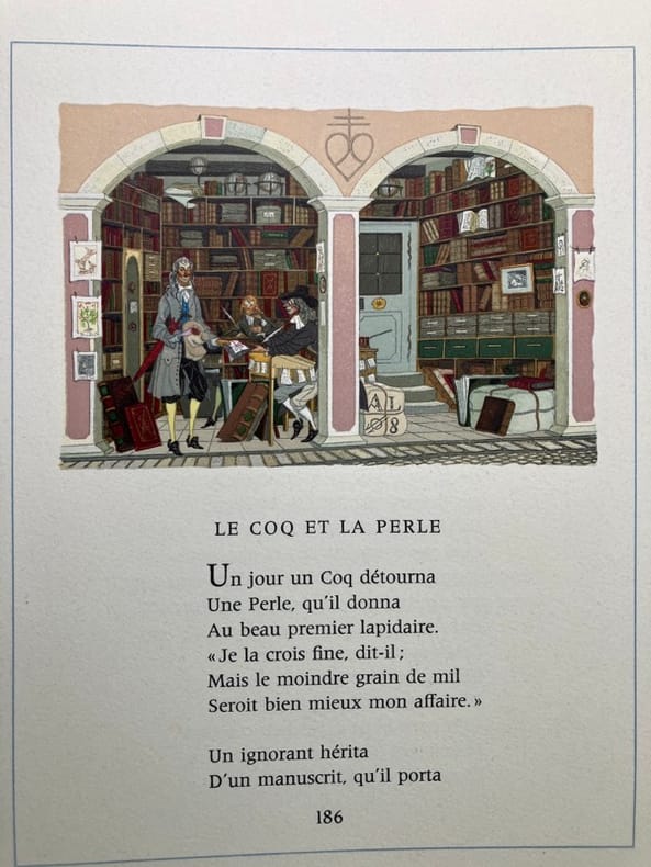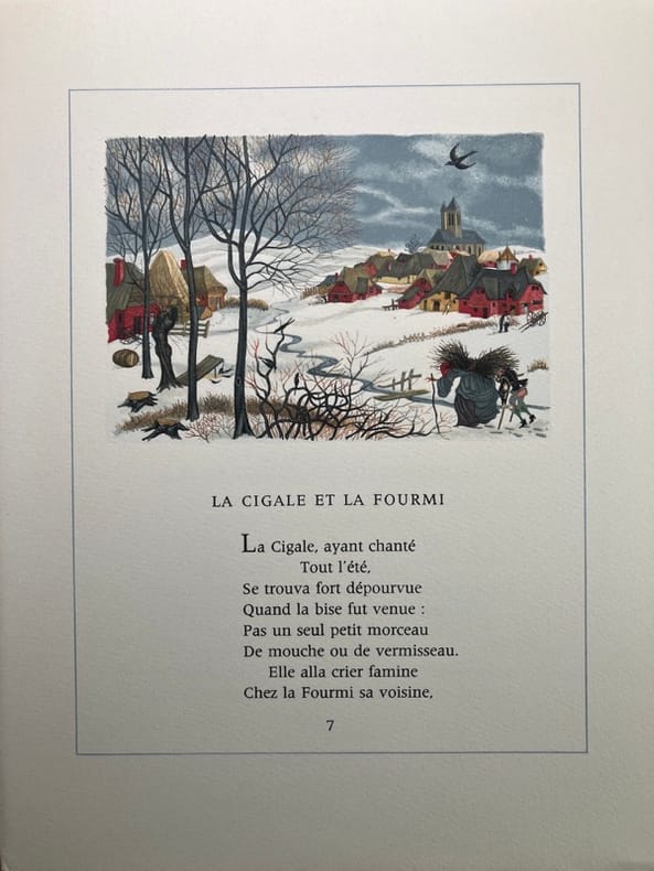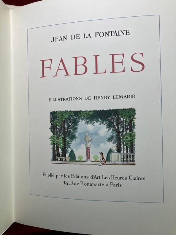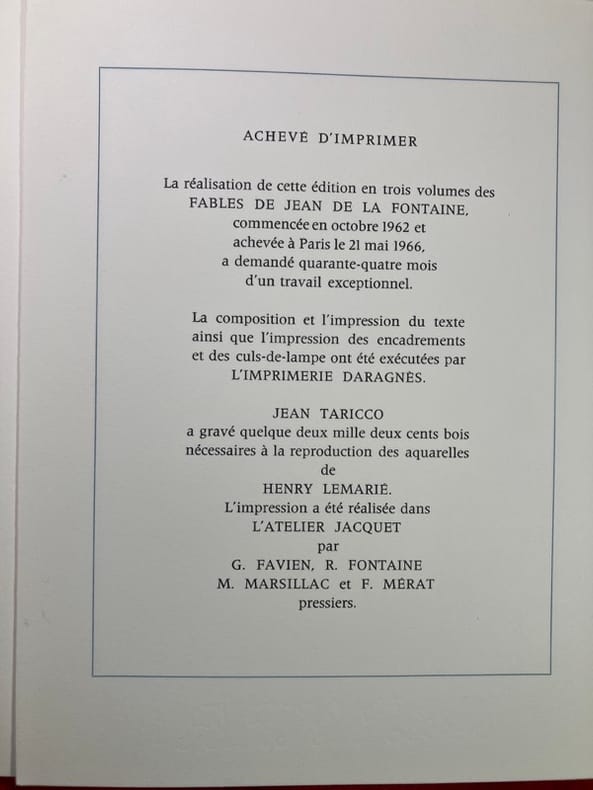 Paris Les Heures Claires 1962-1966 3 volumes in-4, en feuilles, couvertures imprimées (emboîtages de l'éditeur).57 ravissantes illustrations (3 vignettes de titre et 54 à mi-page) dessinées par Henry Lemarié et gravées sur bois en couleurs, ayant nécessité le passage de 2.200 bois. Tirage limité à 3.450 exemplaires numérotés sur vélin de Rives. Un des 2.850 exemplaires. Exemplaire bien complet du fac-similé dune lettre manuscrite de présentation de louvrage par lartiste, illustrée de 2 dessins comportant un lion et une girafe : ... je suis cependant navré de constater que je nai pas eu à illustrer de fables comportant des lions... On ne trouvera pas davantage la girafe dans notre livre, alors que jai toujours eu beaucoup de sympathie pour elle. Je leur devais un petit coup de chapeau : le voilà...