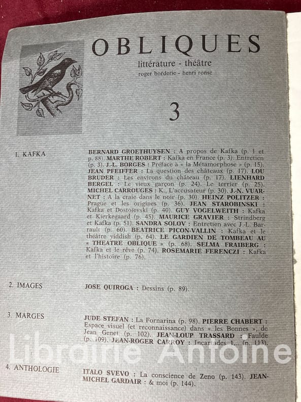 Très bon état. Textes de Bernard Groethuysen, Marthe Robert, J.-L. Borges, Jean Pfeifer, Lou Bruder, Lienhard Bergel, Michel Carrouges, J.-N. Vuarnet, Heinz Politzer, Jean Starobinsky, Guy Vogel weith, Maurice Gravier, Sandra Polov, Beatrice Picon-Vallin, Selma Fraiberg, Rosemarie Ferenczi, dessins de JJose Quiroga, etc. Libraire membre du S.L.A.M. (Syndicat national de la Librairie Ancienne et Moderne) et de la L.I.L.A. (Ligue Internationale de la Librairie Ancienne). N'hésitez pas à prendre contact par mail pour des photographies et des détails supplémentaires, pour des recherches ou des estimations de livres anciens et rares.