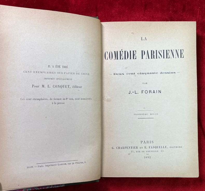 Paris G. CHARPENTIER et E. FASQUELLE 1892 un volume in-12° (183 x 113mm), 248 pp. Reliure en demi-basane bleue, dos à nerfs orné, auteur, titre et fers dorés, gardes de papier marbré (reliure époque). (papier un peu bruni). Dessins en noir de Forain légendés la plupart sous forme de dialogues. La couverture n'a pas été conservée.