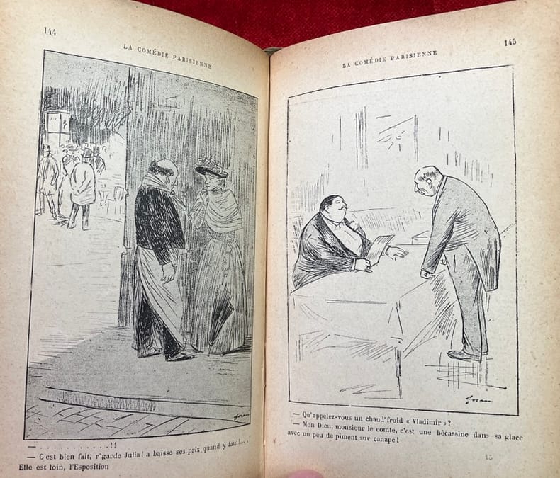 Paris CHARPENTIER ET E. FASQUELLE 1894 un volume (117 x 184mm), 248 pp. Reliure en demi-basane marron, dos lisse orné (reliure époque). (charnières fendillées, dos frotté, plats usés, coins légèrement émoussés, feuillets brunis, quelques salissures, petite auréole brune en bordure de feuillet en fin de volume). Dessins de Forain, quelques-uns ont été coloriés.