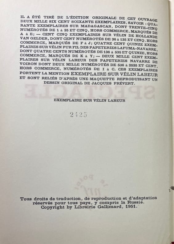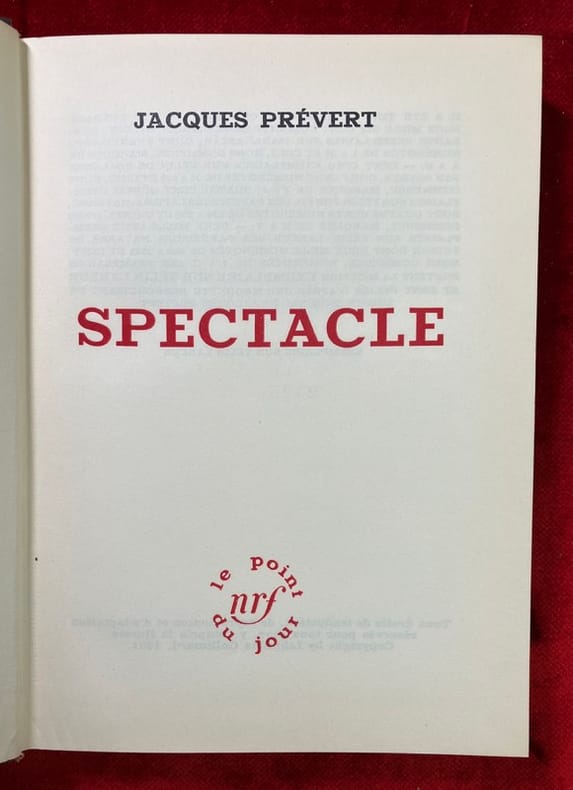 Paris NRF 1951 In-8 (h. 19 cm.) 293 pp. reliure cartonnée et estampée en rouge et blanc selon une maquette reproduisant un dessin de Jacques Prévert.