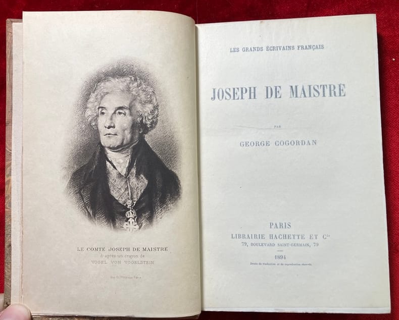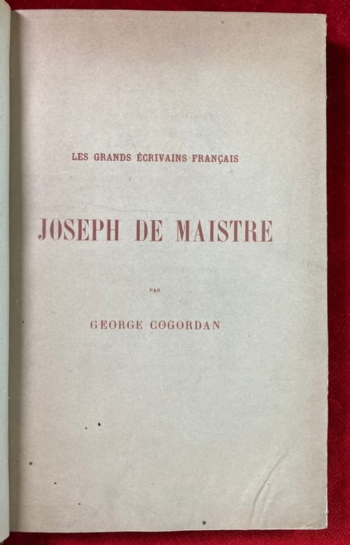 Paris Librairie Hachette et Cie 1894 In-12 (h. 19 cm.) 206 pp. couverture conservée, demi-reliure basane fauve, dos à nerfs, pièces de titre de maroquin vert, tête dorée. Portrait de Joseph de Maistre d'après un dessin de Vogel von Vogelstein.