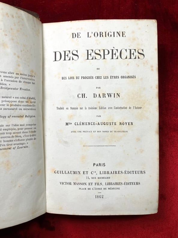 The scarce first edition of the controversial first French translation - bound partly uncut and with the original wrappers - of Darwin's masterpiece, one of the most important books ever printed. This famed translation - done by self-taught female scholar - ended up causing quite a stir and adding to the theory of evolution some for Darwin quite unforeseen interpretations. Because of this, the translator, Clémence Royer, gained notoriety as one of the leading eugenicists of the time. Darwin was very eager to have his work published in French. It is not known exactly how he happened on Royer as the translator, but as she was familiar with the works of Lamarck and Malthus, immediately realized the importance of Darwin's work and also had close connections to the French publisher Guillaumin, she must have seemed perfect for the job. She had a naturalist help her with the biologically technical parts and made an excellent job of the translation. There was one big problem, however - she went well beyond her role as a translator and added a 60-page preface and numerous explanatory footnotes that Darwin had not seen before publication. In the preface, she challenged the belief in religious revelation, she discussed the application of natural selection to the human race, and she presented a pure eugenic theory, explaining the negative consequences of protecting the weak and the infirm. She also promoted her concept of progressive evolution, which had more in common with the ideas of Lamarck than with those of Darwin. Right after having seen the translation, Darwin wrote in a letter to the American botanist, Asa Gray: ""I received 2 or 3 days ago a French translation of the Origin by a Madelle. Royer, who must be one of the cleverest & oddest women in Europe: is ardent deist & hates Christianity, & declares that natural selection & the struggle for life will explain all morality, nature of man, politicks &c &c!!!. She makes some very curious & good hits, & says she shall publish a book on these subjects, & a strange production it will be.""After some reflection, however, Darwin began having more serious doubts, and about a month later he wrote to the French zoologist Armand de Quatrefages: ""I wish the translator had known more of Natural History" she must be a clever, but singular lady" but I never heard of her, till she proposed to translate my book."" He had now also read the footnotes and wrote to Joseph Hooker: ""Almost everywhere in Origin, when I express great doubt, she appends a note explaining the difficulty or saying that there is none whatever!! It is really curious to know what conceited people there are in the world.""Freeman No 655 (Freeman does not mention the plate, which is present here).