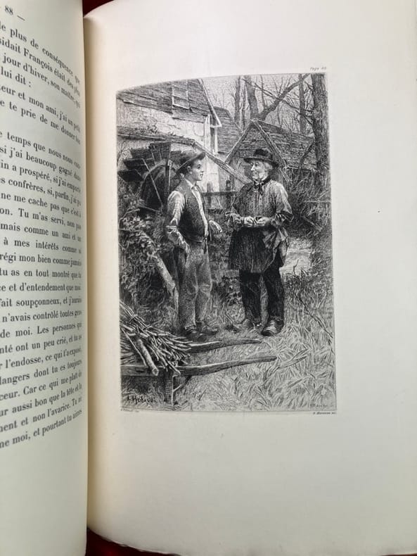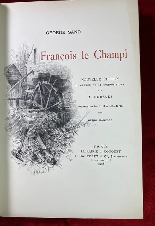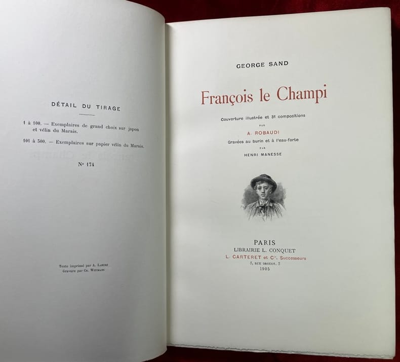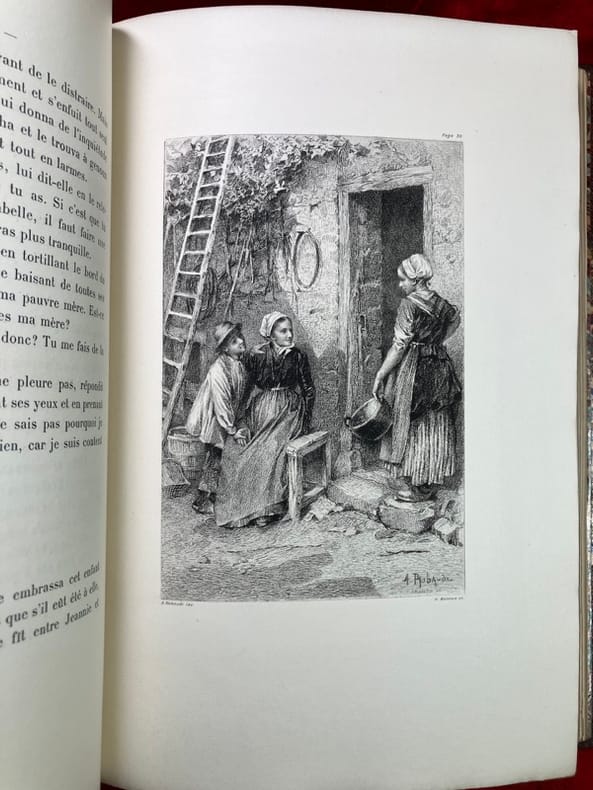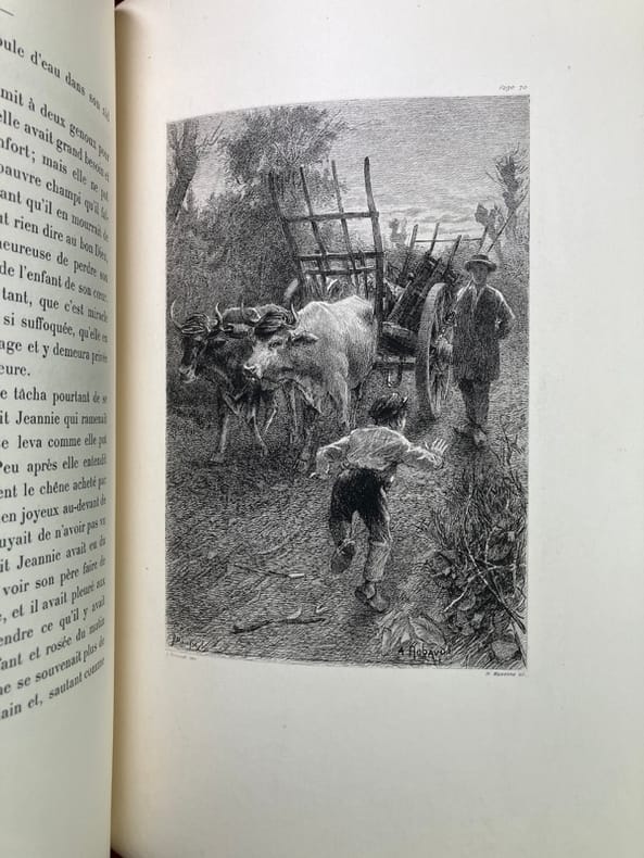 L'un des 100 exemplaires de tête sur Japon, et parmi ceux-ci l'un des 70 contenant deux états des planches dont le tirage à part de toutes les illustrations avant la lettre (n° 42). Le tirage total est de 300 exemplaires. "Belle publication estimée. Robaudi a parfaitement rendu les scènes villageoises comme le côté spécialement sentimental du roman." (Carteret) Dos noirci, craquelure au mors supérieur, intérieur superbe. (MONOD, 10133 ; CARTERET, IV, 358)