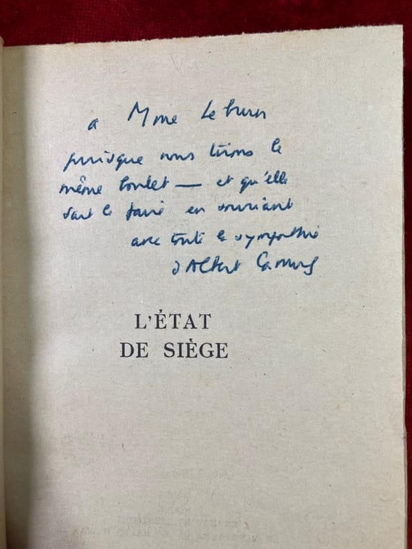 Edition originale, service de presse. Avec le rare prière d'insérer tiré sur papier jaune (pliure et déchirure). Bel envoi autographe amusant signé d'Albert Camus sur le faux-titre.Petite réparation avec reprise discrète au dos sinon très bon état (non coupé). Libraire membre du S.L.A.M. (Syndicat national de la Librairie Ancienne et Moderne) et de la L.I.L.A. (Ligue Internationale de la Librairie Ancienne). N'hésitez pas à prendre contact par mail pour des photographies et des détails supplémentaires, pour des recherches ou des estimations de livres anciens et rares.