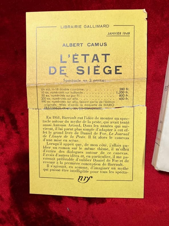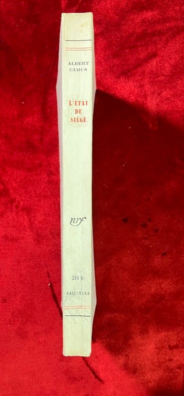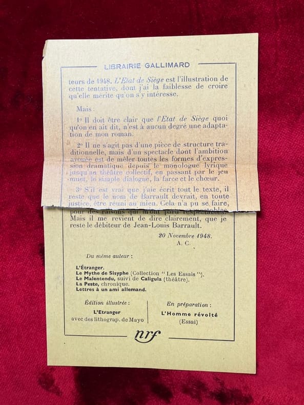 Paris Gallimard 1948 1 vol. Broché in-12, broché, 233 pp. Edition originale. Un des 235 exemplaires numérotés sur alfa Navarre, celui-ci hors commerce (n°XLI), comprenant un bel envoi autographe signé de l'auteur : "à Pierre Brasseur, magnifique Nada puisqu'il y croyait ! avec l'affectueuse gratitude d'Albert Camus". On relève des notes à l'encre pour la mise en scène sur les quatre dernières pages du texte, groupes de mots soulignés ou placés entre parenthèses, dialogue barré et mot ajouté. Petite tache sur le premier feuillet affectant légèrement l'envoi, sinon bonne condition.