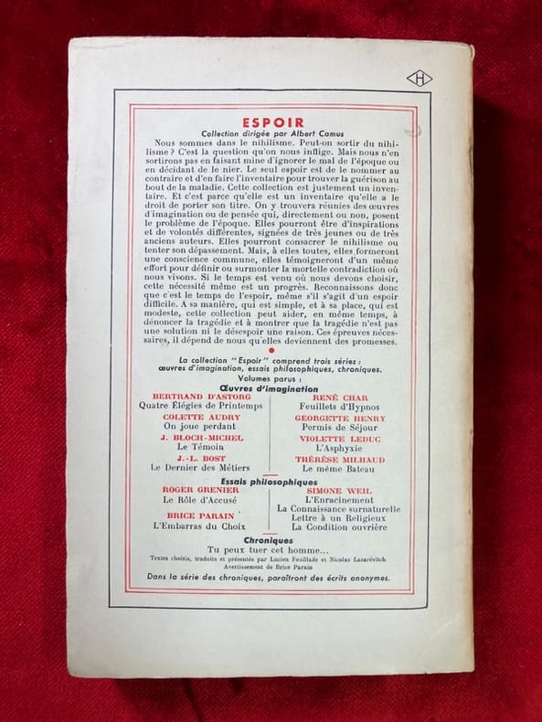 Signature d'Albert Camus sur le cinquième feuillet (avec la citation d'Hölderlin). Dos insolé avec petites réparations. Libraire membre du S.L.A.M. (Syndicat national de la Librairie Ancienne et Moderne) et de la L.I.L.A. (Ligue Internationale de la Librairie Ancienne). N'hésitez pas à prendre contact par mail pour des photographies et des détails supplémentaires, pour des recherches ou des estimations de livres anciens et rares.