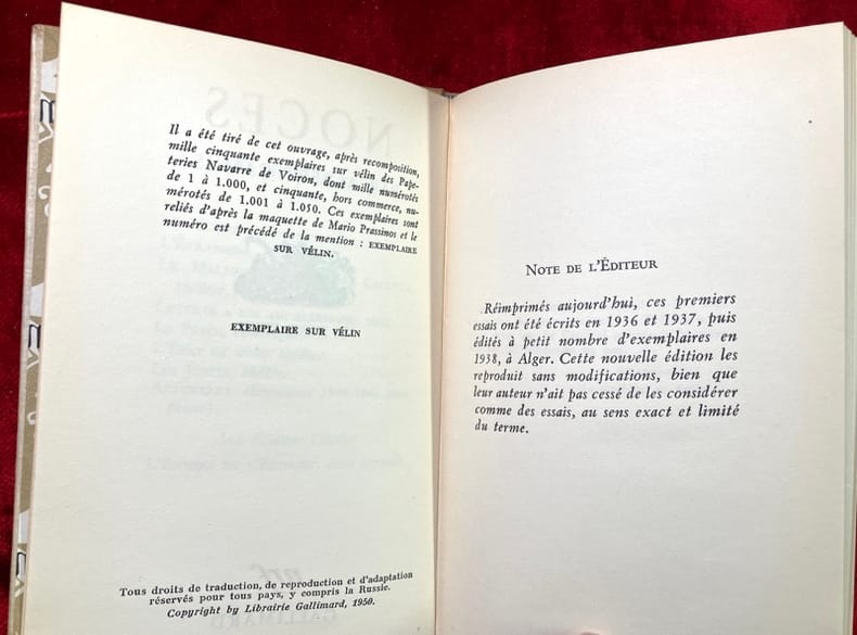ATTENTION EDITION 1970 Noces (Les Essais XXXIX) Camus, Albert Gallimard, Broché, BROCHE TB